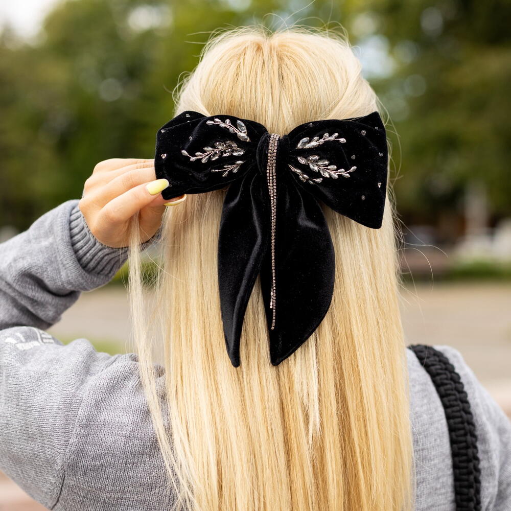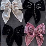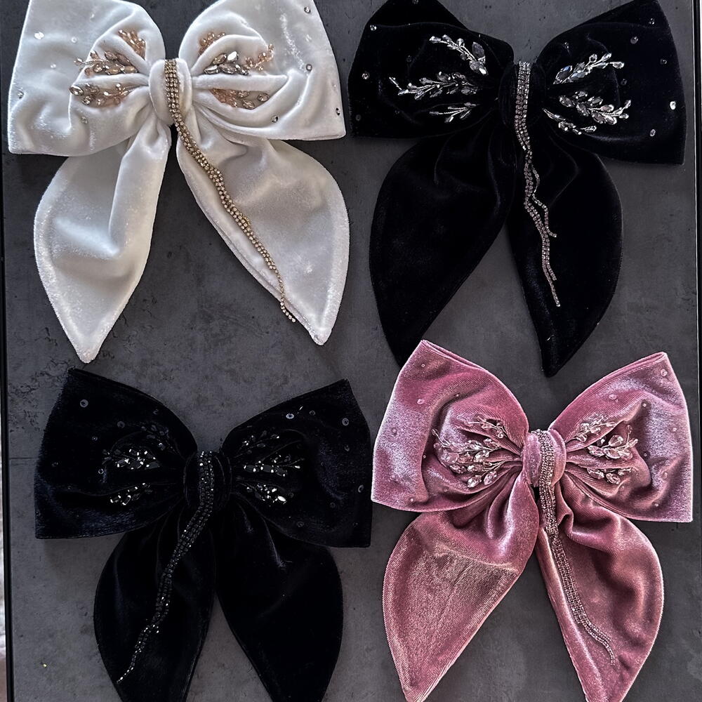 Large Velour Hair Bow with Beaded Embellishment Add a touch of glamour to your hairstyle with this stunning large velvet hair bow. Handcrafted from plush velour,this bow is adorned with intricate beadwork, each bead meticulously sewn by hand to create a unique and sparkling design. The rich texture of the velour combined with the detailed beaded embellishments makes this hair accessory a perfect statement piece for any occasion, whether it’s a special event or a stylish everyday look. Each bow is individual and one-of-a-kind, go to the profile and see in other colors.