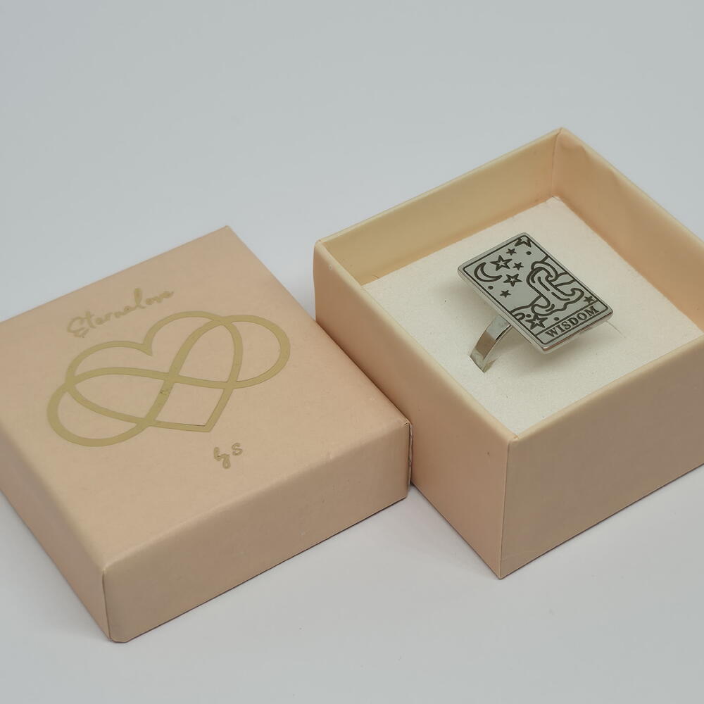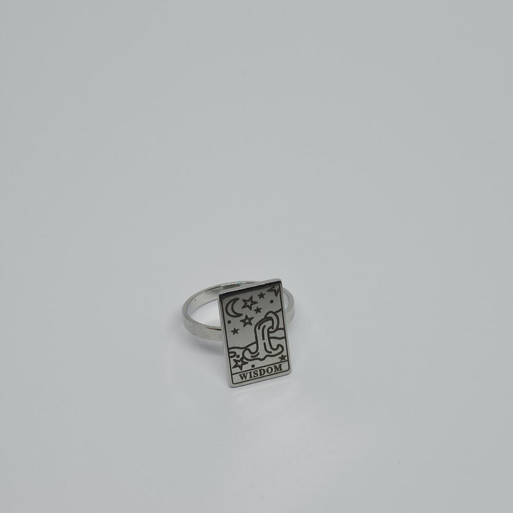 A symbolic tarot-inspired ring engraved with celestial elements and the word WISDOM. This piece represents intuition, clarity, and inner guidance — a reminder to trust your own path. The adjustable ring ensures a comfortable fit, making it perfect for everyday wear or meaningful gifting. Carefully packed in an elegant gift box, ready to be worn or gifted. ✨