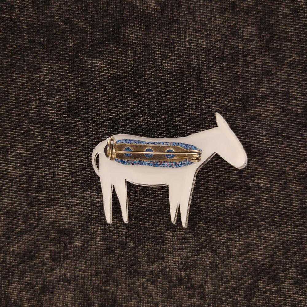Материјал: рециклирана пластика Дизајн: магарећа слика направљена помоћу водоотпорног УВ штампања задржава осветљеност и јасноћу узорка. Величина: 34 к 45 мм. Носач: сигурна копча, погодна за било коју одећу.