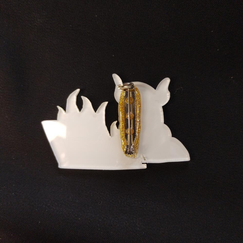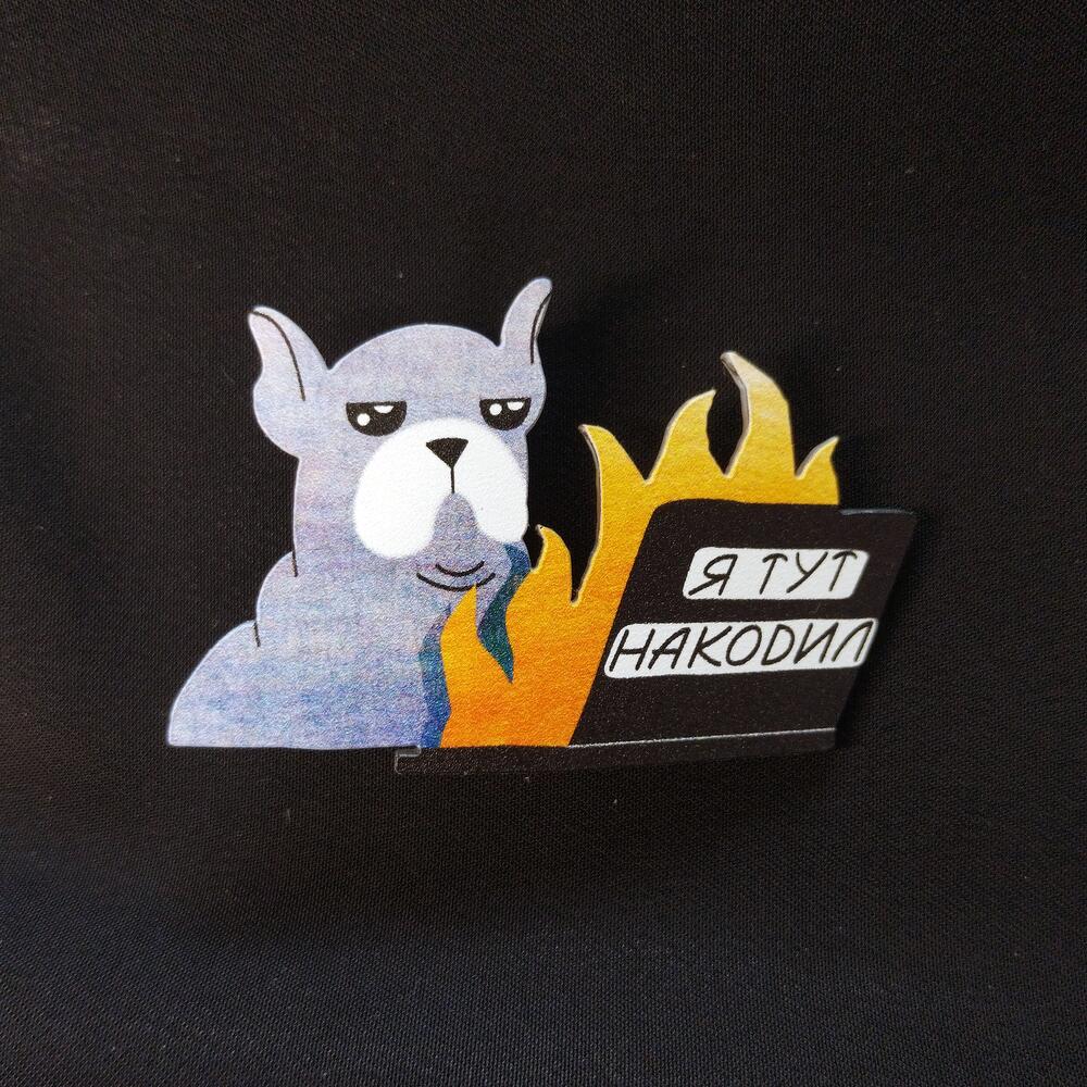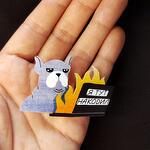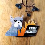 Brooch with a bulldog behind a laptop, a great gift for programmers. Size 35 by 53 mm. Made using water resistant UV printing.