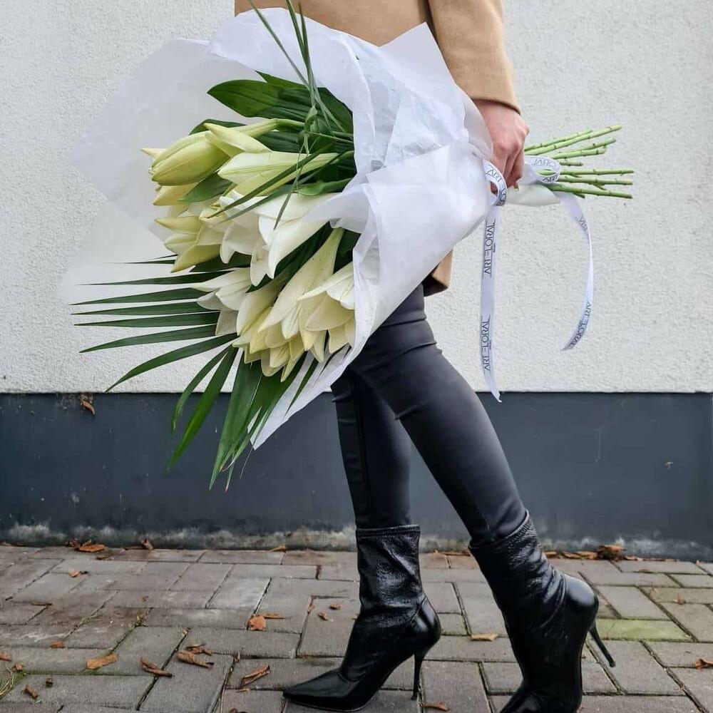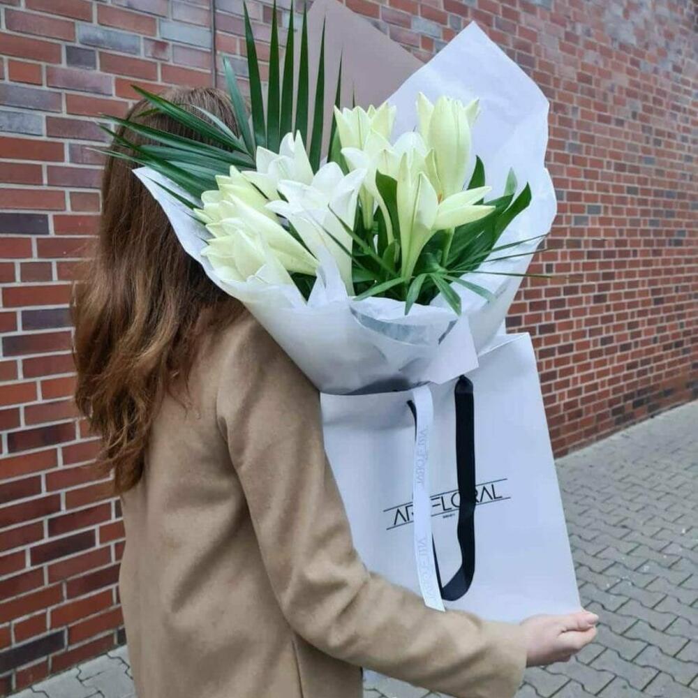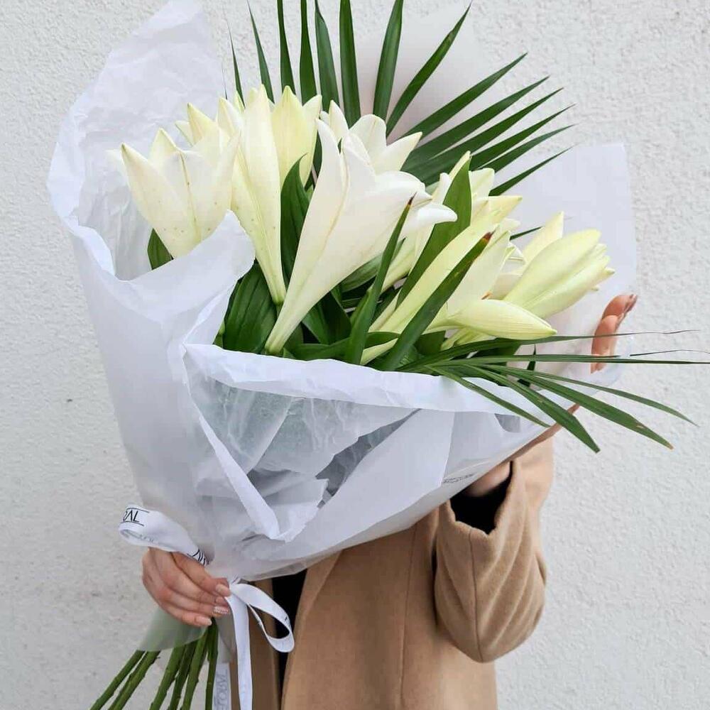 Blumenstrauß Eleganz Die weißen Lilien sind Symbole für Reinheit und Unschuld. Ihre atemberaubenden, glockenförmigen Blüten strahlen eine Aura von Schönheit und Anmut aus. Die Palmblätter verleihen diesem Bouquet eine exotische Note und erinnern an tropische Paradiese. Ein Bouquet aus weißen Lilien und Palmblättern eignet sich perfekt, um Ihre Gefühle auszudrücken, sei es zu besonderen Anlässen wie Hochzeiten oder Jubiläen oder einfach, um jemandem zu zeigen, wie sehr Sie ihn bewundern. Dieser Strauß ist ein Symbol für die Schönheit der Natur und der außergewöhnlichen Gefühle, die Herzen im Sturm erobern und die Seele berühren. Wir achten ständig auf die letzten Trends im Bereich des Floristikdesigns und unsere Bouquets sind die Reflexion davon. Bei der Zusammenstellung verwenden wir nur ganz frische Blumen und die modernsten Materialien. Unser Team steckt besondere Liebe zum Detail in jedes Arrangement, deshalb finden Sie immer einen Sticker mit unserem Logo und ein Firmen Bändchen als Qualitätssiegel an jedem Strauß. Dem Blumenstrauß legen wir eine Anleitung zur Pflege und ein Mittel zur Verlängerung der Lebensdauer der Blumen bei. Jetzt ganz bequem bestellen und Ihre Blumen an Ihre Wunschadresse liefern lassen.