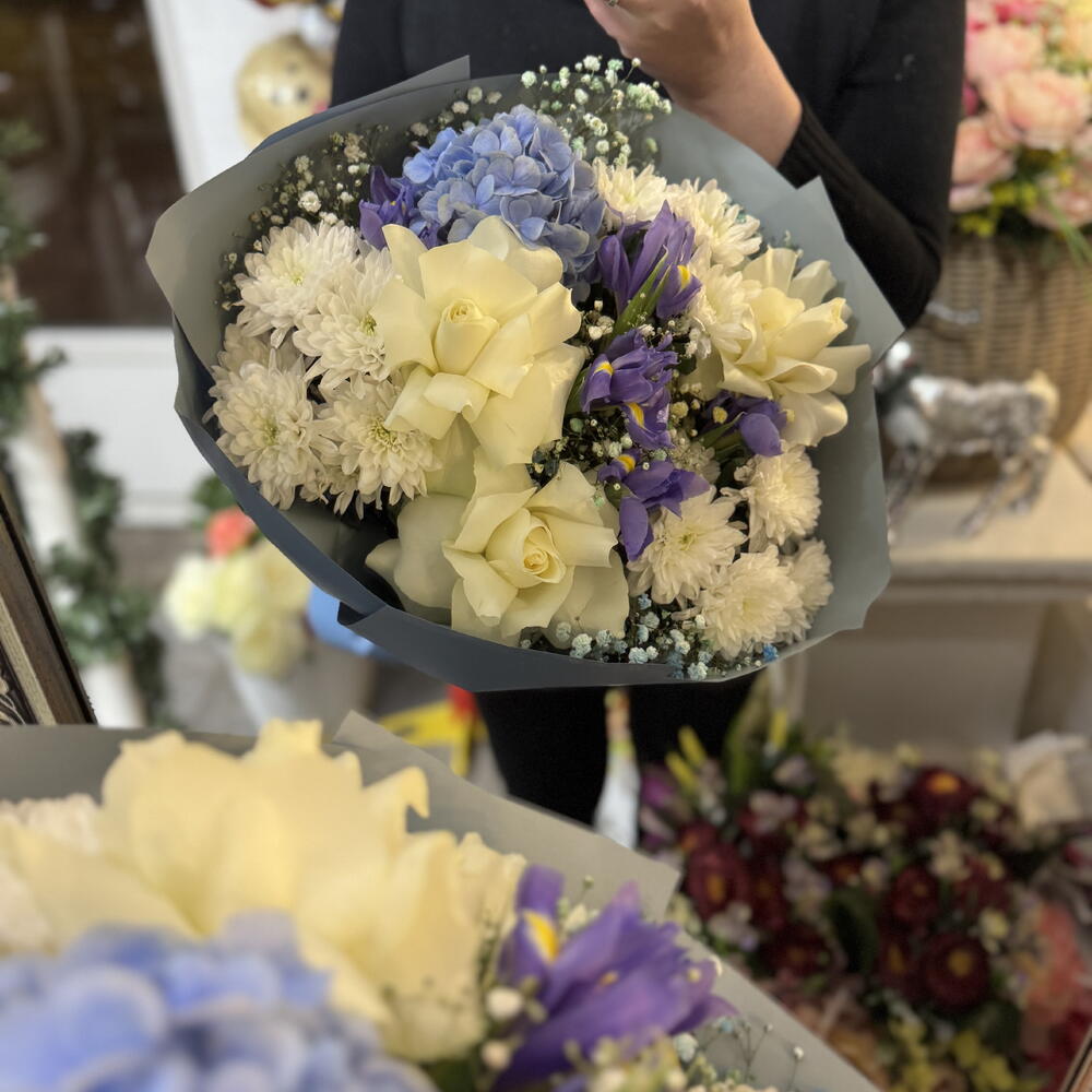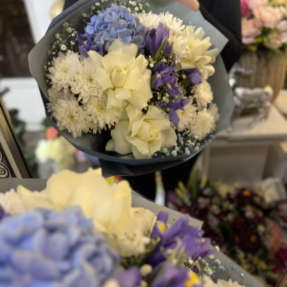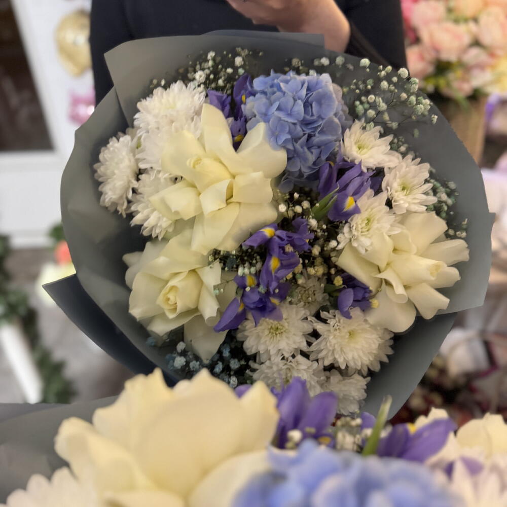 Гортензия - 1 дана Хризантема - 3 дана Iris blue - 5 дана Гипсофила - 2 дана prantsusse roses - 3 дана
