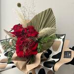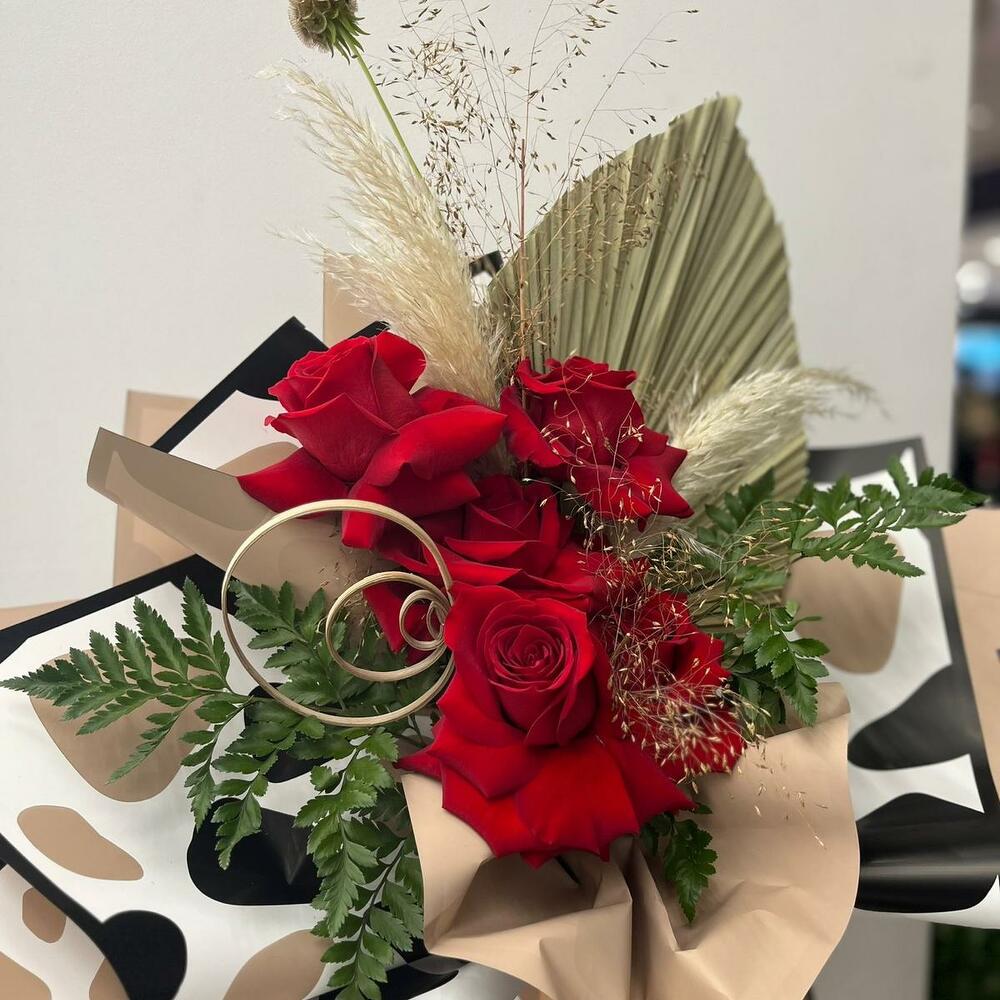 Қызыл раушан - 3 дана Сатин таспа - 1 дана орау қағазы - 4 дана пампас шөбі - 2 дана palm leaf - 1 дана mixed greens - 2 дана