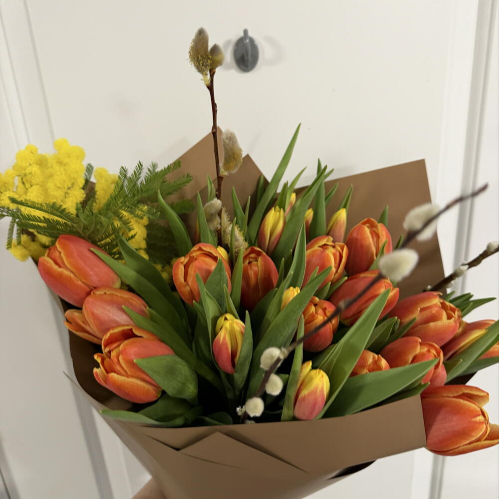 Bask in the charm of our Florists Special arrangement. This bouquet embodies true elegance with the radiant beauty of 19 hand-picked tulips, delicately arranged with 7 pieces of ethereal pussywillow. Its a graceful blend of nature’s finest blooms, perfect for any occasion or simply to brighten someones day. Experience the splendor of tulips and the delicate allure of pussywillow with this exquisite offering.