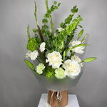 Гербера - 3 дана Лилиялар - 2 дана гвоздикалар - 3 дана жасыл қоспа - 1 дана гортензия - 3 дана бақ раушандары - 5 дана ирландиялық қоңыраулар - 5 дана гладиолустар - 5 дана