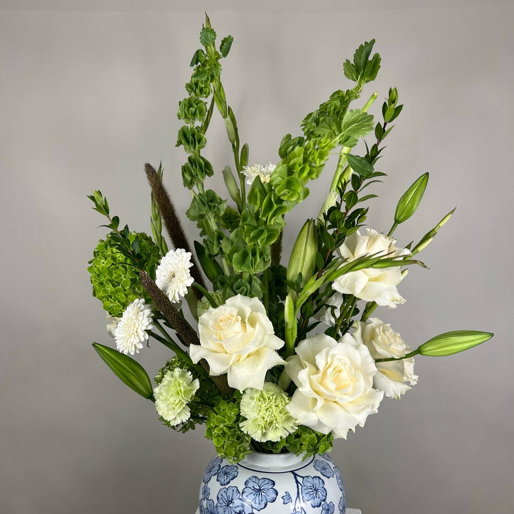 Гербера - 3 дана Лилиялар - 2 дана гвоздикалар - 3 дана жасыл қоспа - 1 дана гортензия - 3 дана бақ раушандары - 5 дана ирландиялық қоңыраулар - 5 дана гладиолустар - 5 дана