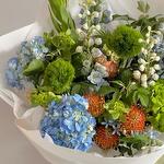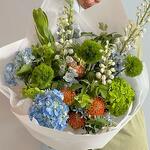 көк дельфиниум - 5 дана гортензия - 5 дана түрік гвоздикасы - 5 дана инелерге арналған жастықшалар - 3 дана
