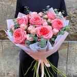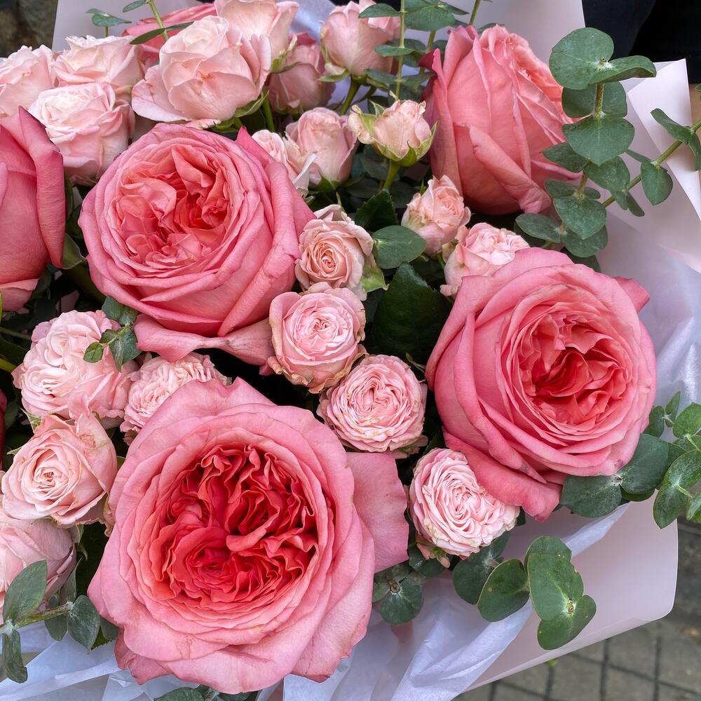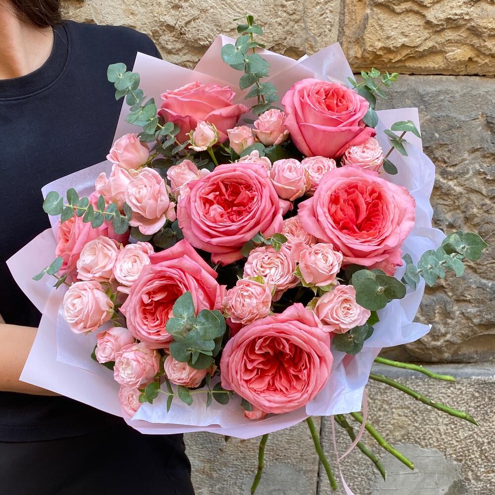 packaging design - 4 дана ribbon satin - 1 дана bombastic rose - 6 дана қызғылт әсер - 7 дана eucalipto cinerea - 3 дана