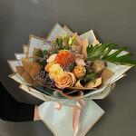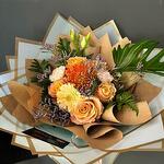 Лента - 1 дана Лимониум - 3 дана Lisianthus - 1 дана папоротник - 3 дана гвоздика - 2 дана orange rose - 4 дана wraping paper - 8 дана mixed greens - 1 дана a special flower - 1 дана