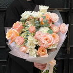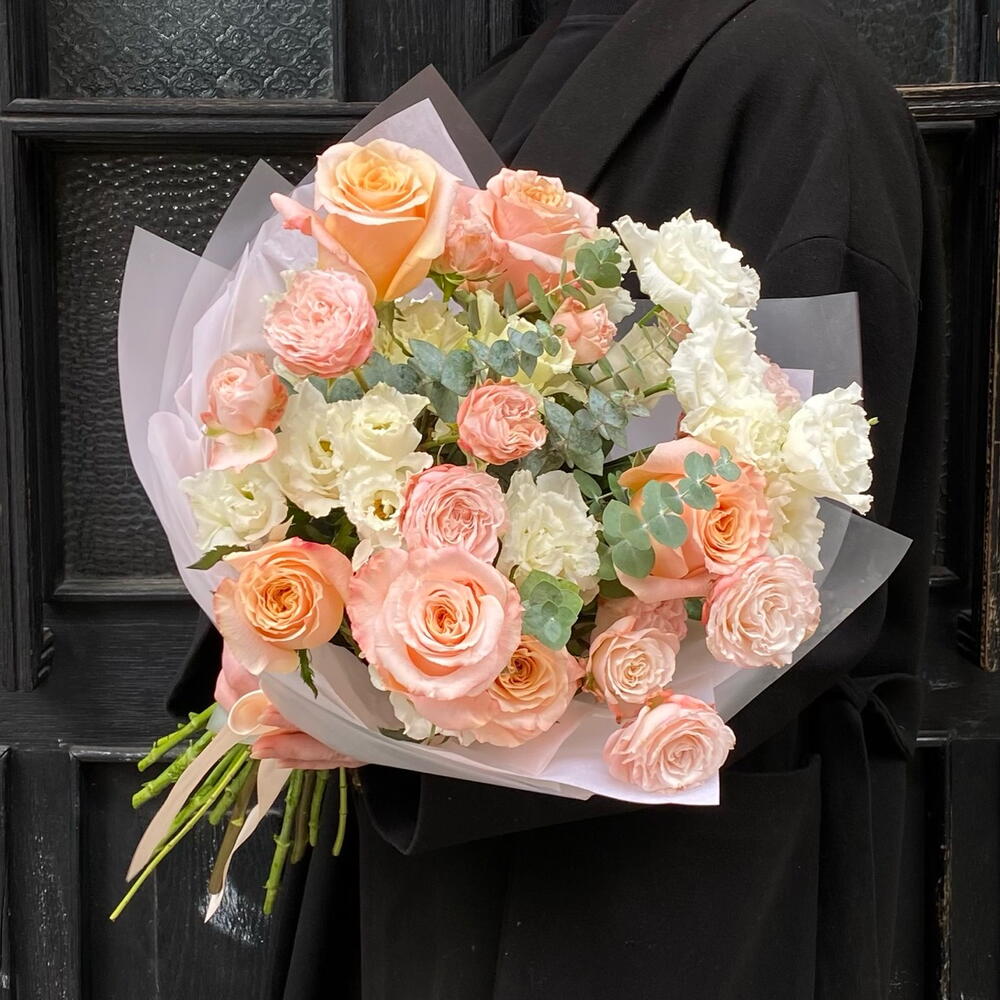 Эустома - 5 дана Спрей раушан - 3 дана Ecuadorian rose - 6 дана packaging design - 5 дана эвкалипт - 1 дана