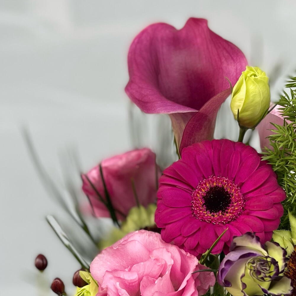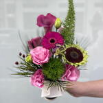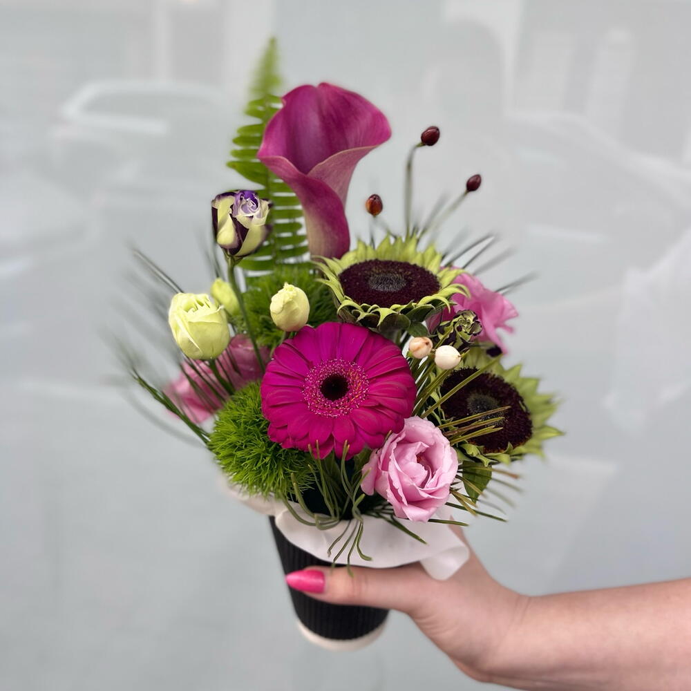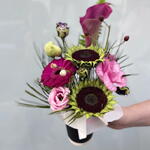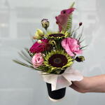 Эустома - 1 дана Күнбағыс - 2 дана Гербера - 1 дана калла - 1 дана кесе - 1 дана