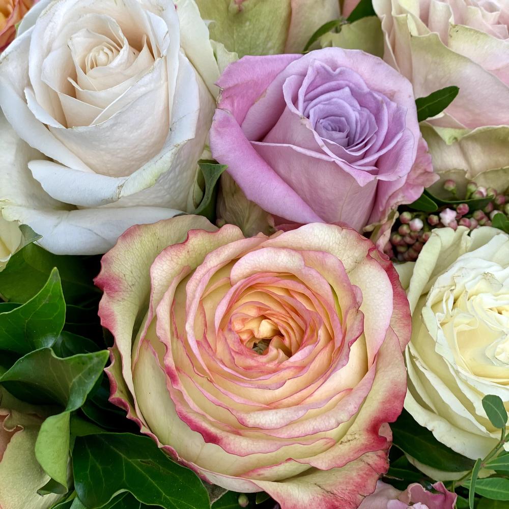 21 mixed roses in a bushy green bed set. Height about 30 cm, diameter about 30 cm possible colors: mixed Arrangement is without vase and possible to send also via post.