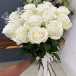 Fresh white roses, arranged in a neat round bouquet. A classic thats always appropriate and expresses feelings without words.