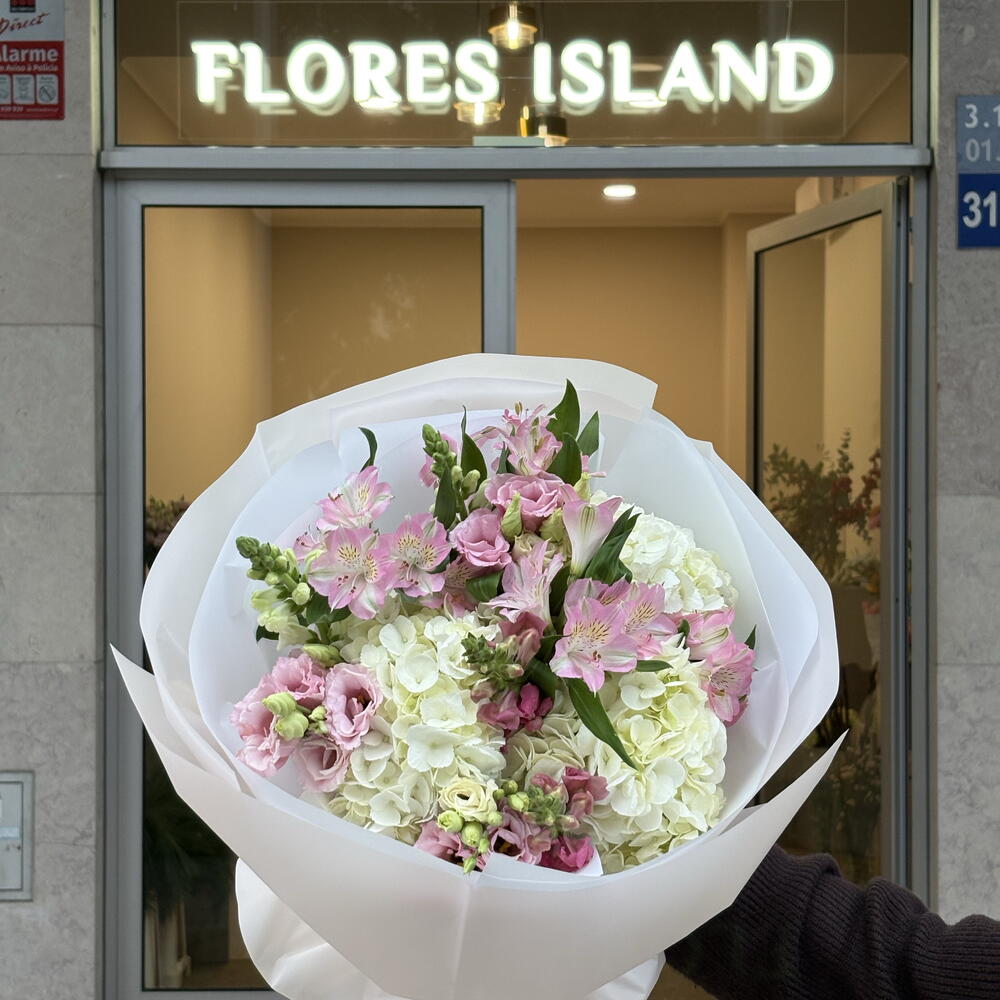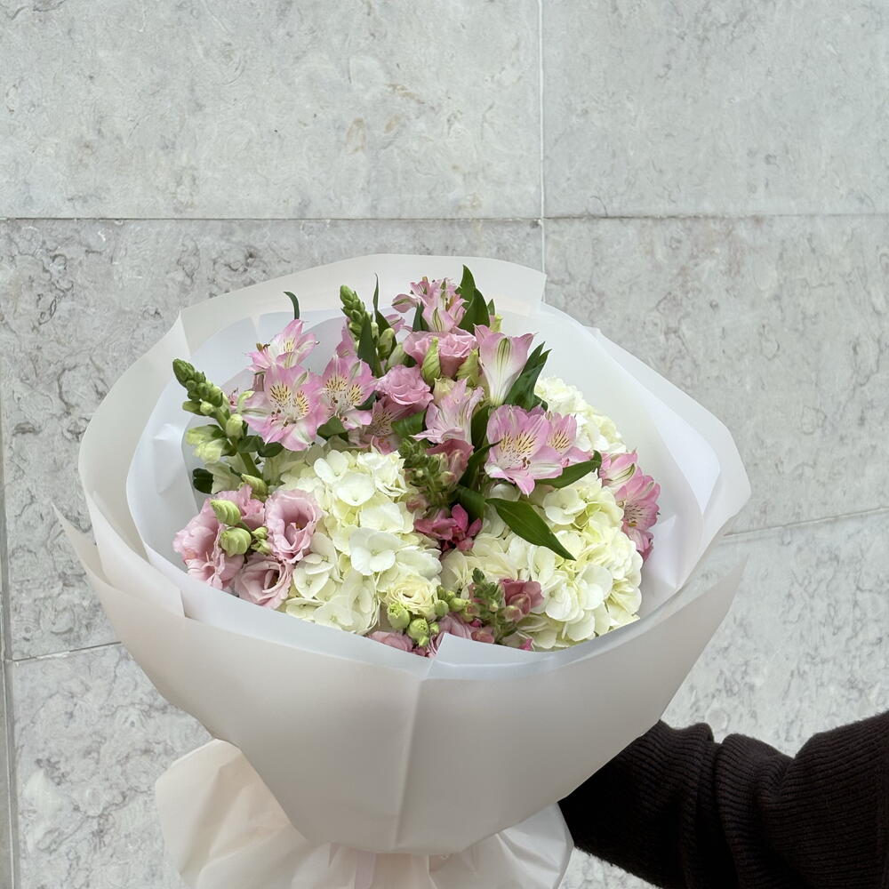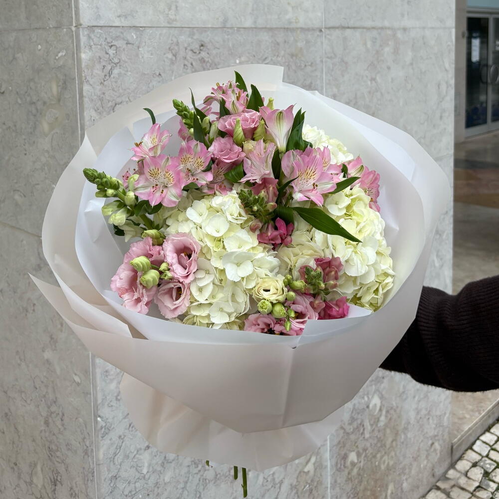 This remarkable Florists Special is designed to evoke serenity and charm. Comprising three beautiful Hydrangeas, four vibrant Alstroemerias, three textured Lisianthus, and two exquisite antirrinums, this bouquet becomes an artistic composition. Exuding elegance and sophistication, this arrangement brings together the beauty of nature and the art of floral arrangement in an unforgettable fusion, making it an ideal gift for any occasion.