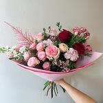 астильба - 1 дана matthiola - 1 дана қорғаңыз - 1 дана popierius - 2 дана vaškagėlė - 1 дана raudona rožė - 3 дана gvazdikas - 1 дана kreminė rožė - 1 дана raudonas smulkiažiedė rožė - 1 дана rožinė smulkiažiedė rožė - 2 дана smulkus eukaliptas - 1 дана rožinė rožė - 2 дана