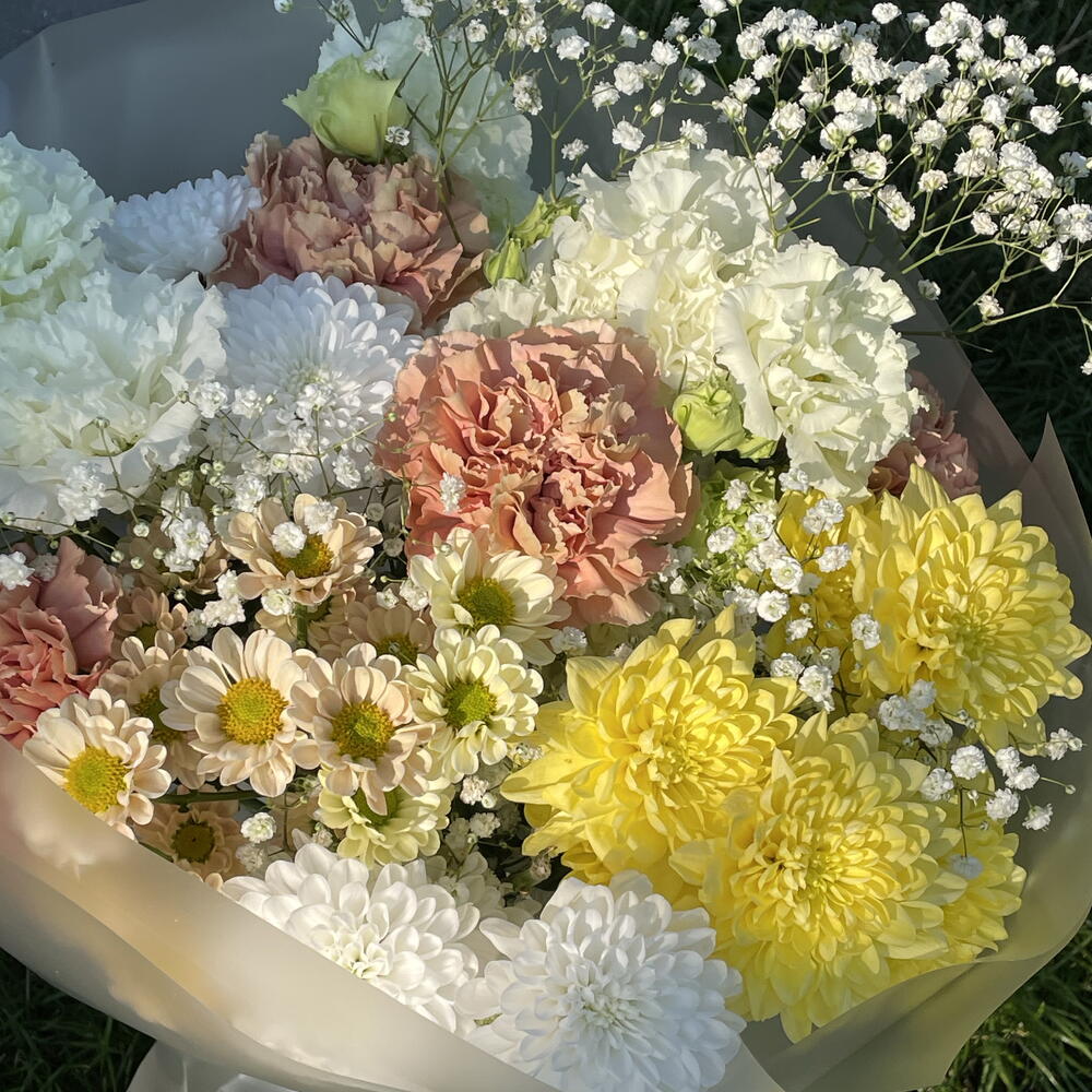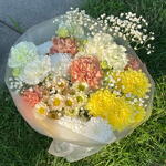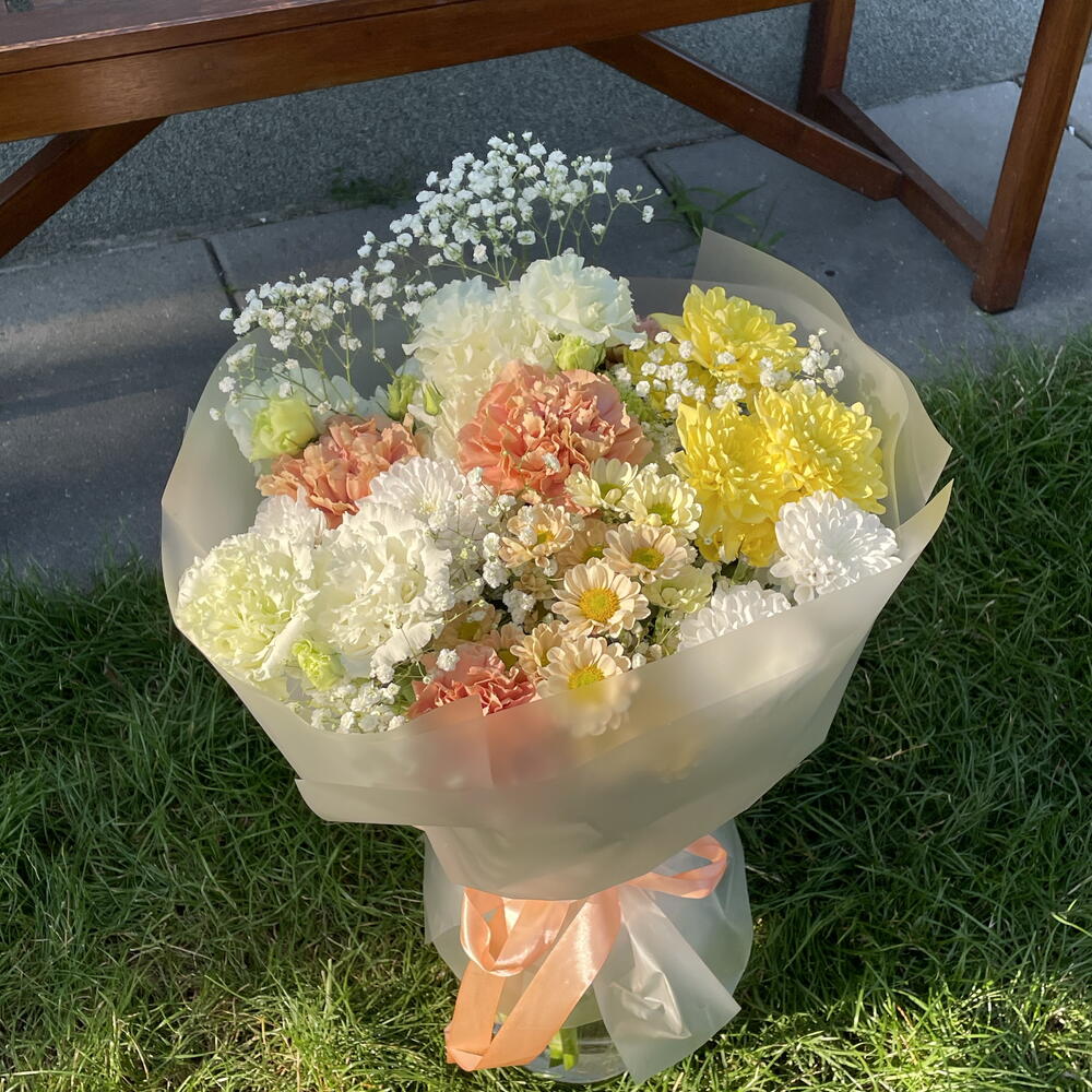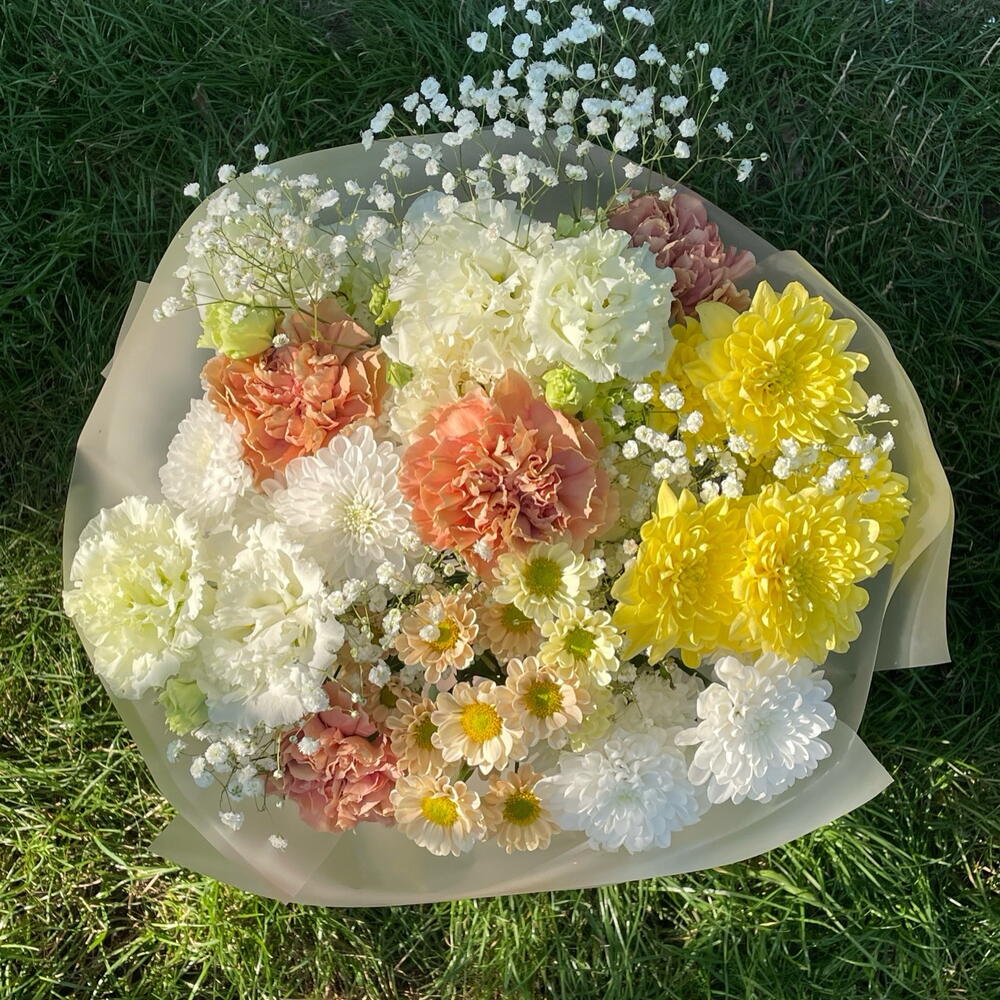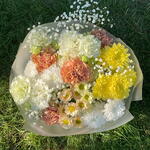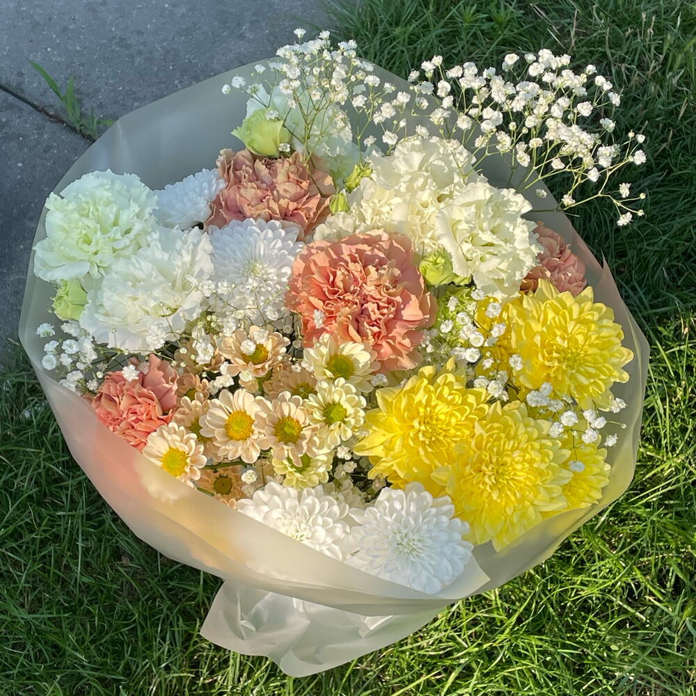 Лента - 1 дана Эустома - 2 дана santini - 1 дана қағаз - 4 дана диантус - 4 дана гипсофила - 1 дана хризантема - 3 дана