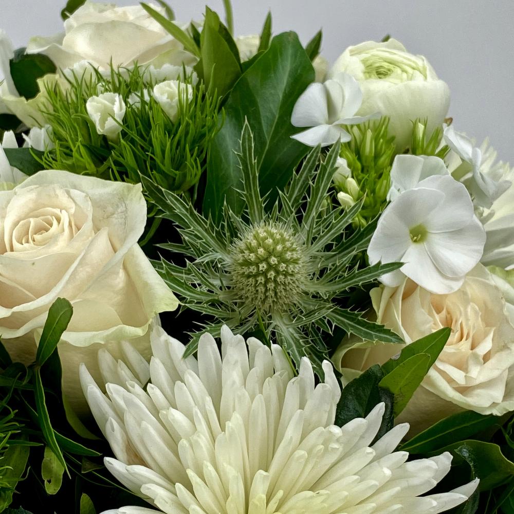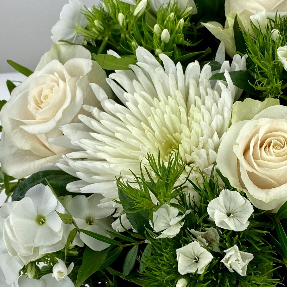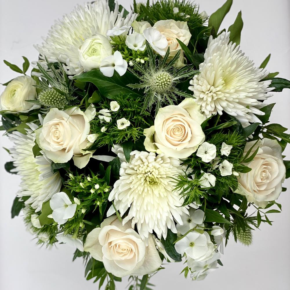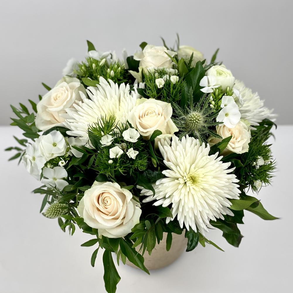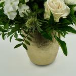 Flower arrangement in gold pot 4 roses 3 chrysanthemums 4 phlox Thistle and various green seasonal stuff Size about 35 cm in diameter high aprx. 35 cm