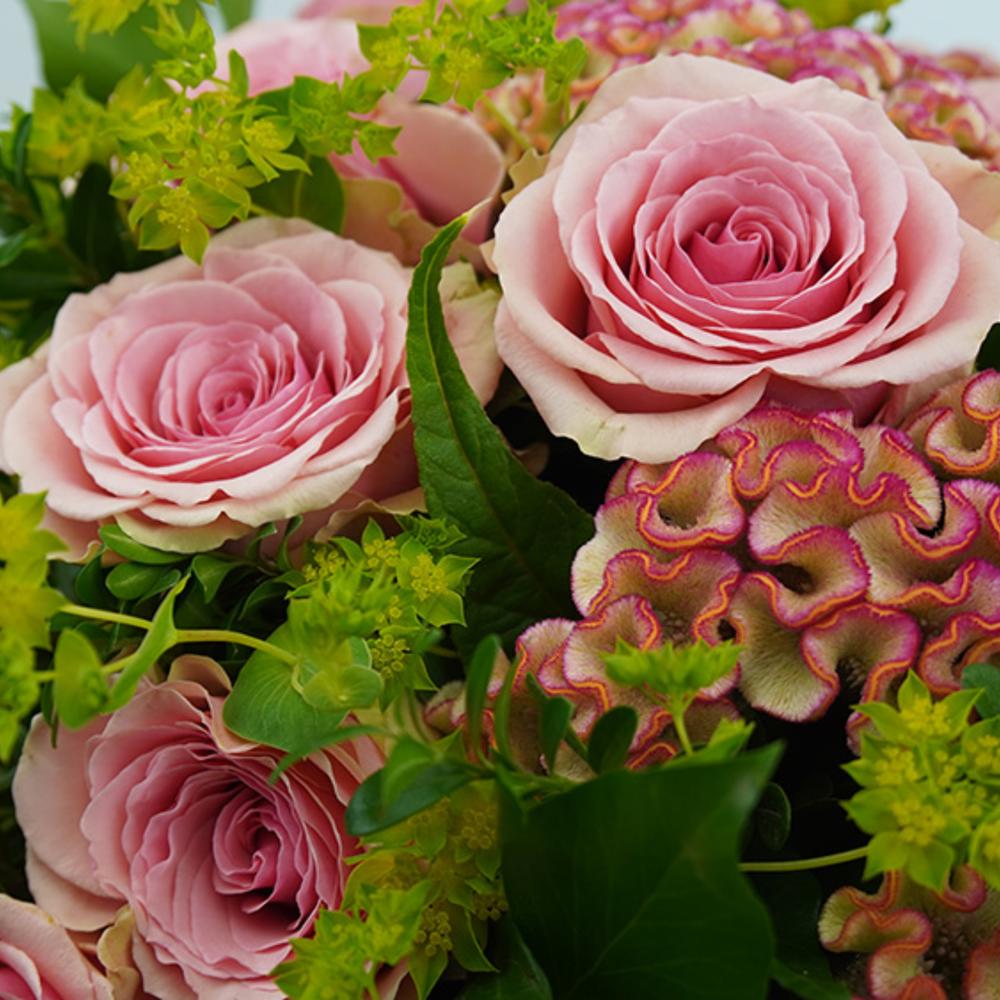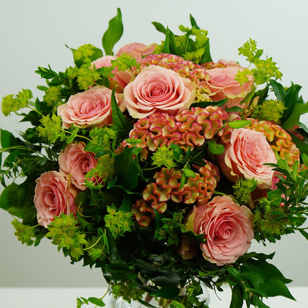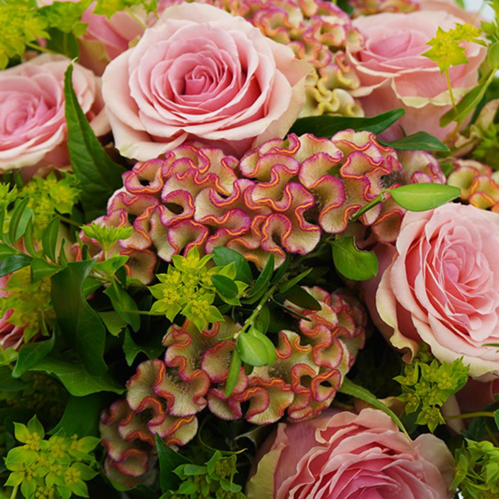 12 Roses 5 Celosia Various green Diameter 40 cm, height 35 cm Possible colours: pink / yellow / orange