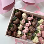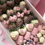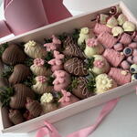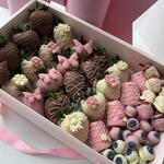 20 juicy strawberries, 4 banana bites, raspberry-almond clusters, and sweet blueberries — all beautifully arranged and tied with a soft pink ribbon.