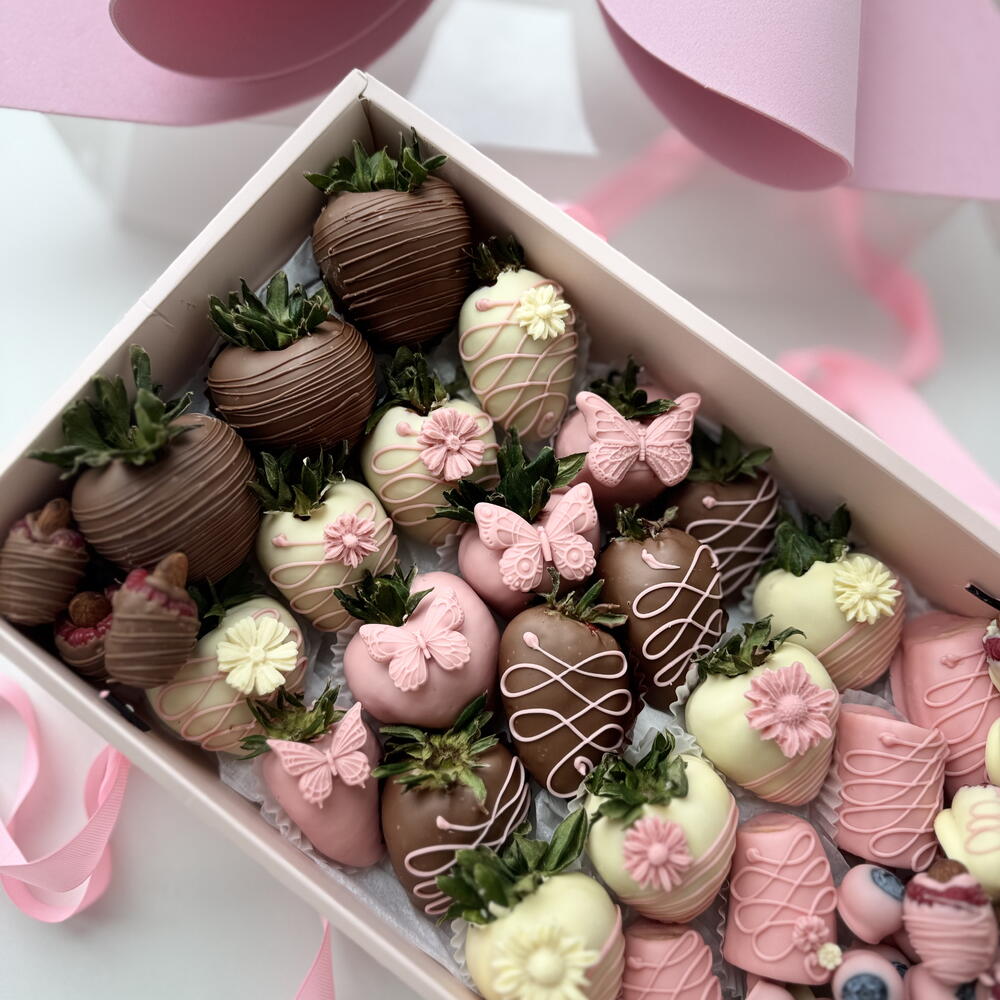 20 juicy strawberries, 4 banana bites, raspberry-almond clusters, and sweet blueberries — all beautifully arranged and tied with a soft pink ribbon.
