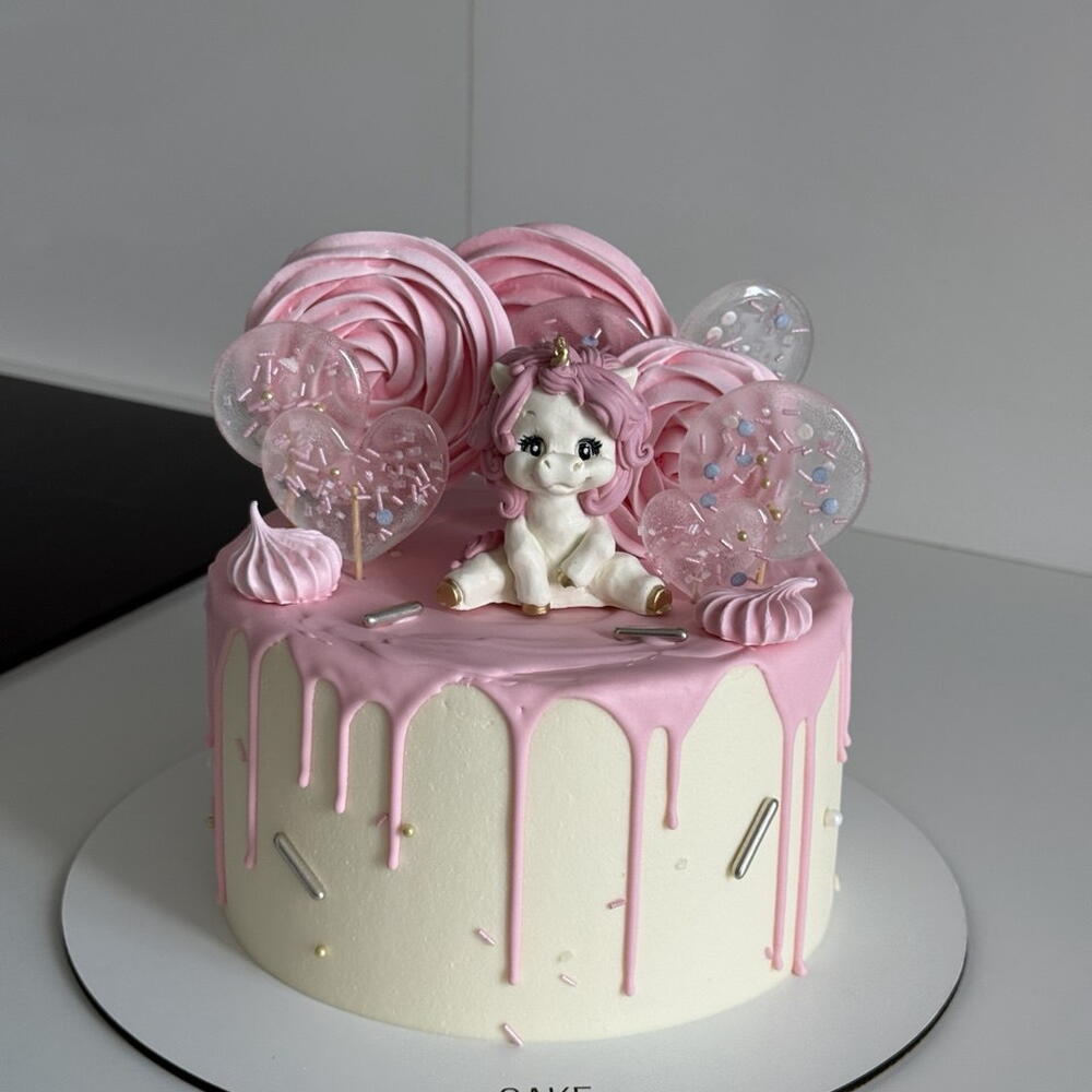 Bolo de bebê com figura de chocolate, merengue pirulitos