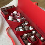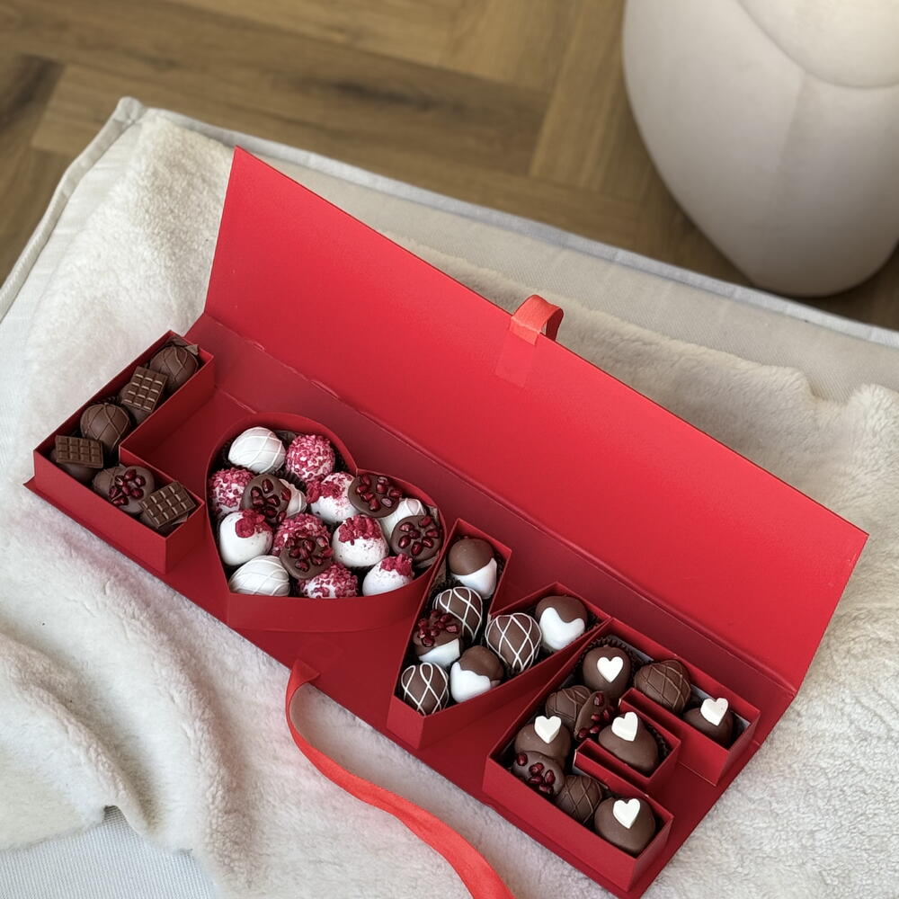 Zestaw 25 truskawek w czekoladzie mlecznej i białej. Każda truskawka udekorowana mini czekoladkami oraz liofilizowaną maliną, co nadaje wyjątkowego smaku i eleganckiego wyglądu. Używamy wysokiej jakości białej i mlecznej czekolady marki Callebaut. Całość zapakowana w stylowe pudełko „Love” – idealne na prezent dla bliskiej osoby. 💝🍓