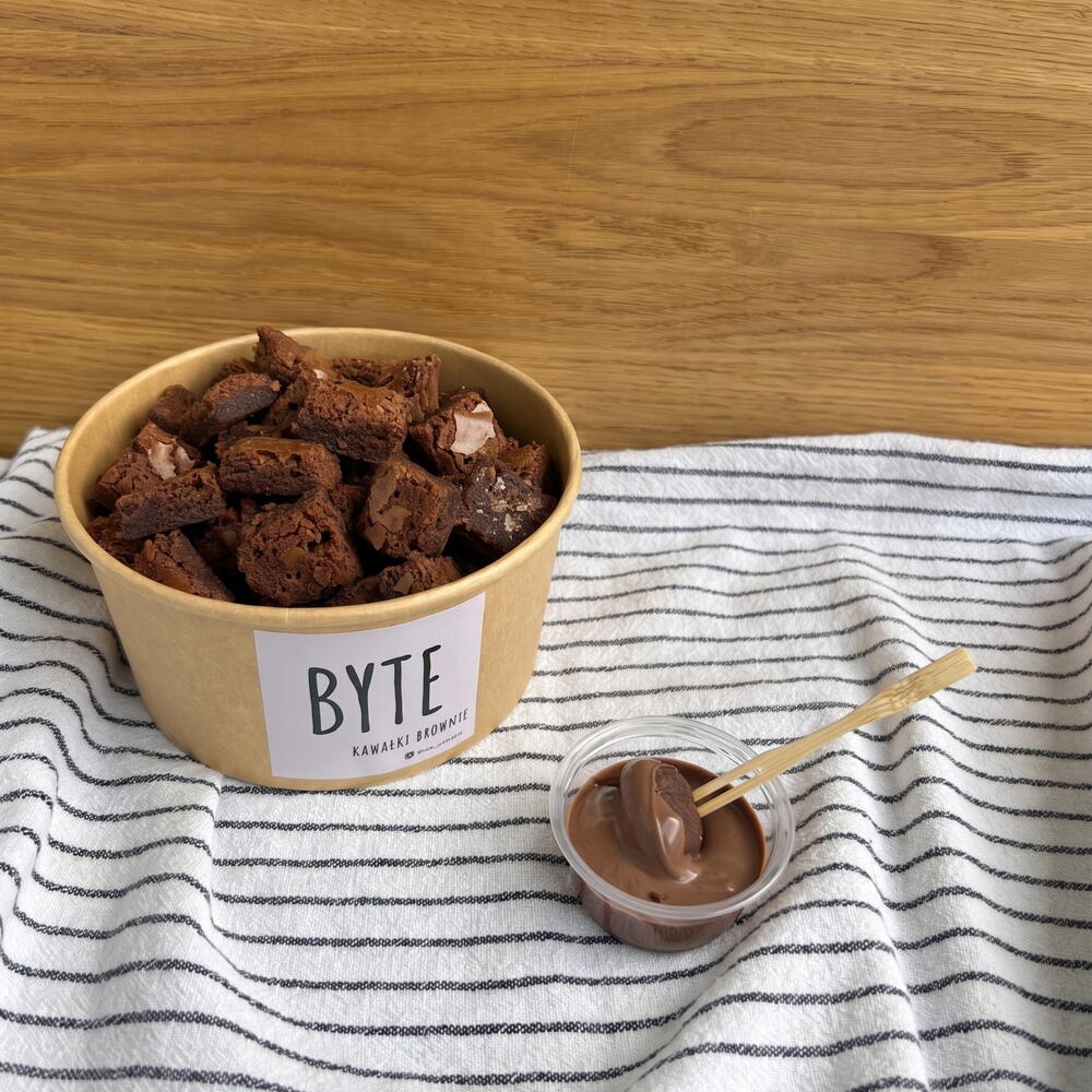 Pudełko domowych mini brownie z wybranym sosem. Miękkie, chrupiące, zrobione tego samego dnia. Sosy: czekoladowy, karmelowy, biała czekolada. Pudełko zawiera około 60 brownie.