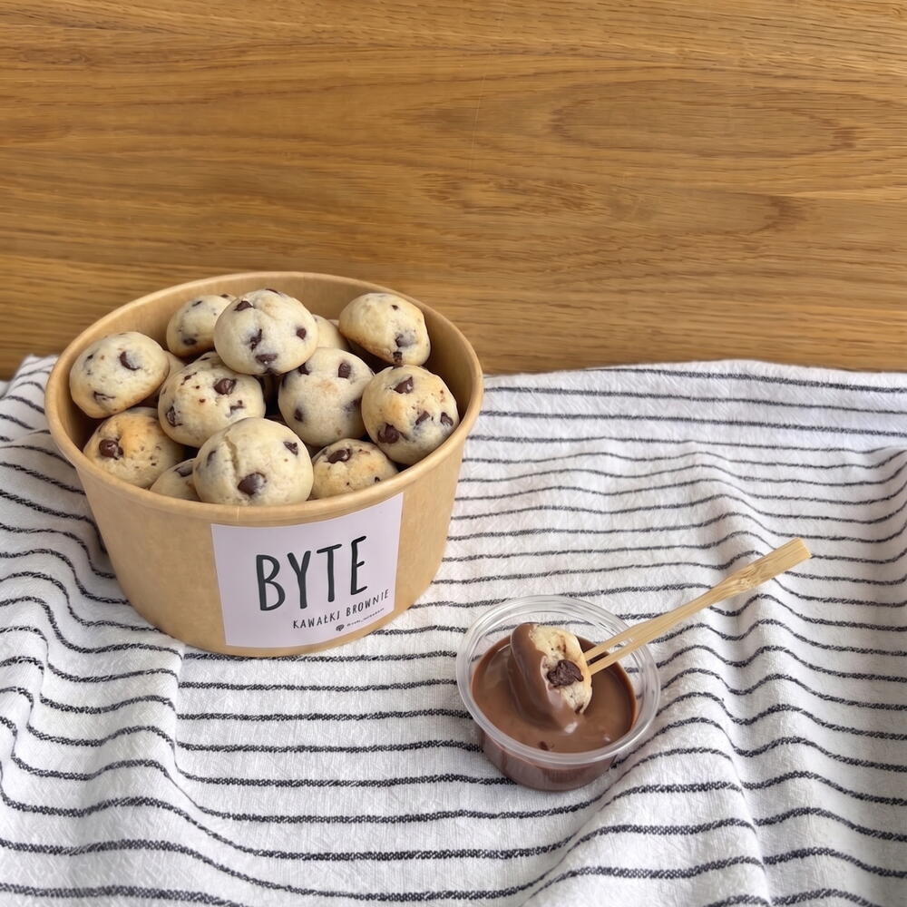Pudełko domowych mini ciasteczek z kawałkami czekolady z wybranym sosem. Miękkie, chrupiące, zrobione tego samego dnia. Sosy: czekoladowy, karmelowy, biała czekolada. Pudełko zawiera około 40 ciasteczek.