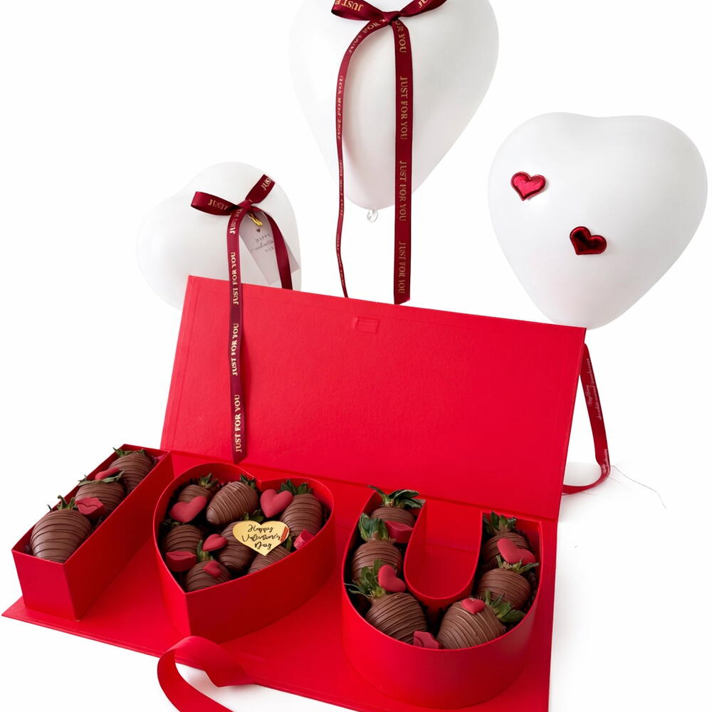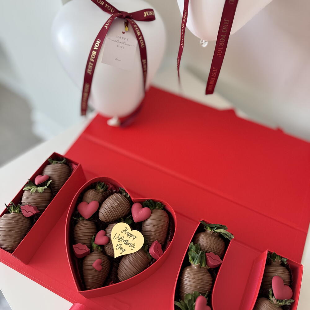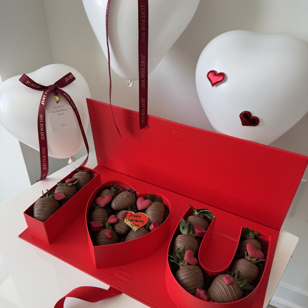 A bold and romantic gift designed to make a statement. This luxury red box features chocolate-covered strawberries arranged in a beautiful I ❤️ U design, finished with elegant details and heart-shaped balloons. 🍓 Fresh strawberries dipped in premium milk chocolate ❤️ “I Love You” layout with a heart-shaped centerpiece 🎁 Luxury red box, beautifully finished with a ribbon 🎈 Includes decorative heart balloons for an extra romantic touch Perfect for Valentine’s Day, anniversaries, or a meaningful surprise for someone special.