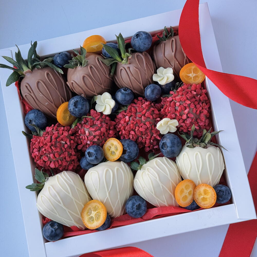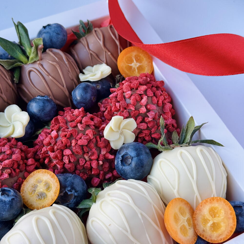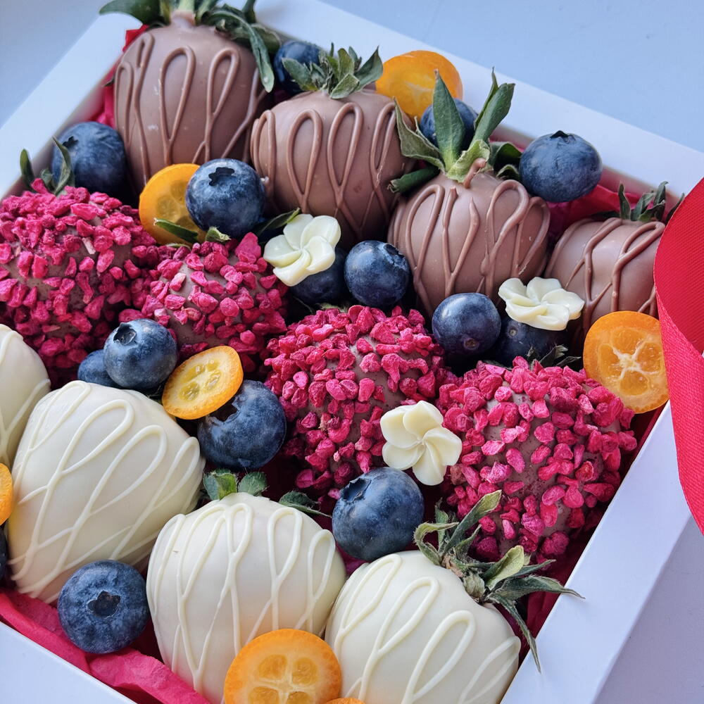 Pięknie skomponowane pudełko świeżych truskawek zanurzonych w gładkiej mlecznej i białej czekoladzie, uzupełnione kawałkami pokrytymi owocami jagodowymi. Kompozycję wzbogaca delikatna dekoracja z sezonowych owoców i jagód, dodająca świeżości, koloru i wyjątkowego charakteru każdemu pudełku. Idealna równowaga elegancji i smaku, co czyni je doskonałym prezentem na specjalne okazje lub słodką niespodzianką. Każdy element jest starannie ułożony, by stworzyć prawdziwie przyciągające wzrok i pyszne doznanie. Dostępne tylko na zamówienie.