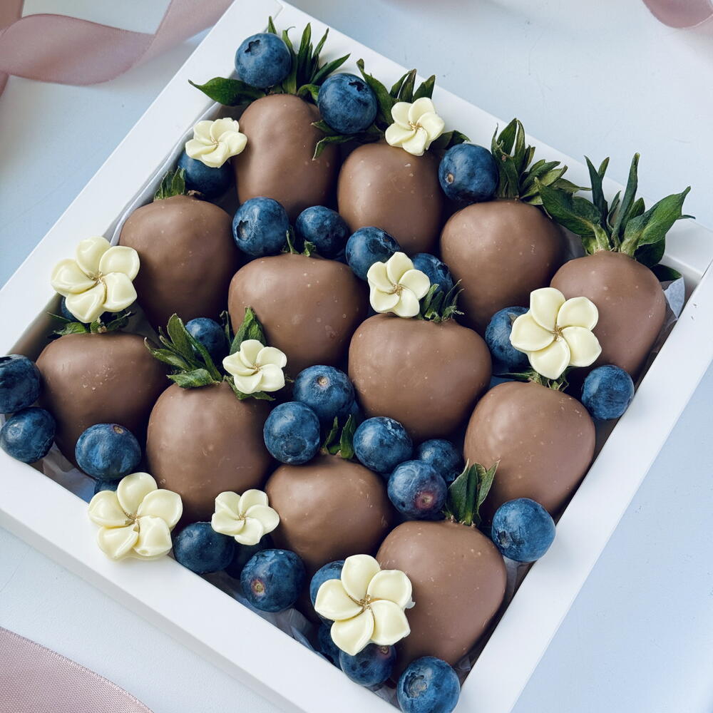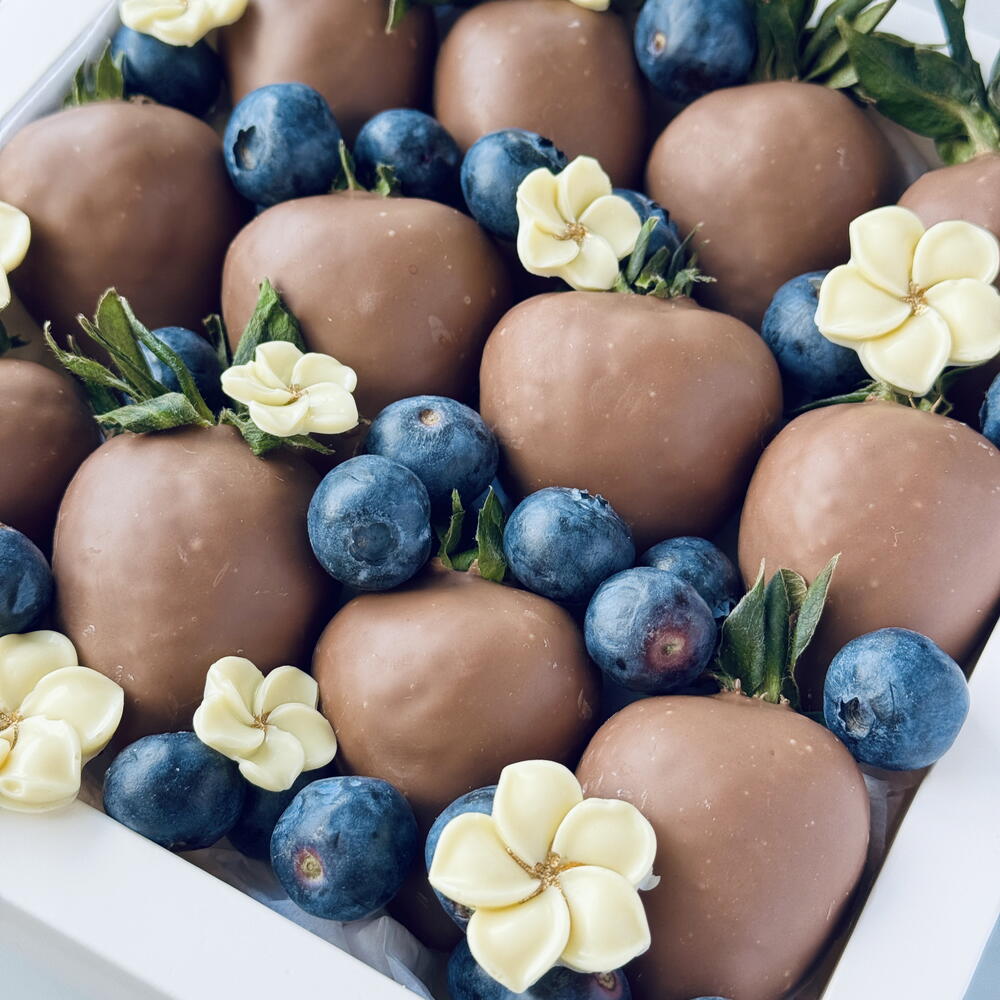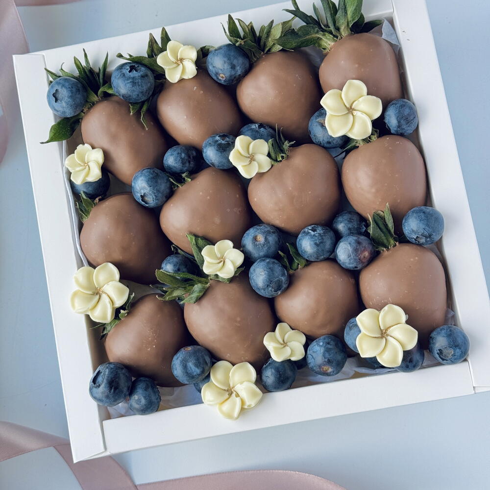 Eleganckie pudełko soczystych truskawek oblanych gładką mleczną czekoladą, idealnie skomponowane ze świeżymi borówkami i delikatnymi kwiatowymi akcentami. To wyrafinowane połączenie tworzy luksusowy wygląd i nieodparty smak. Idealny prezent na wyjątkowe okazje lub słodki sposób, by zaskoczyć kogoś, na kim ci zależy. Każdy element jest starannie wyselekcjonowany i pięknie ułożony, by zachwycić od pierwszego spojrzenia. Dostępne wyłącznie na zamówienie.