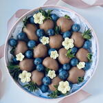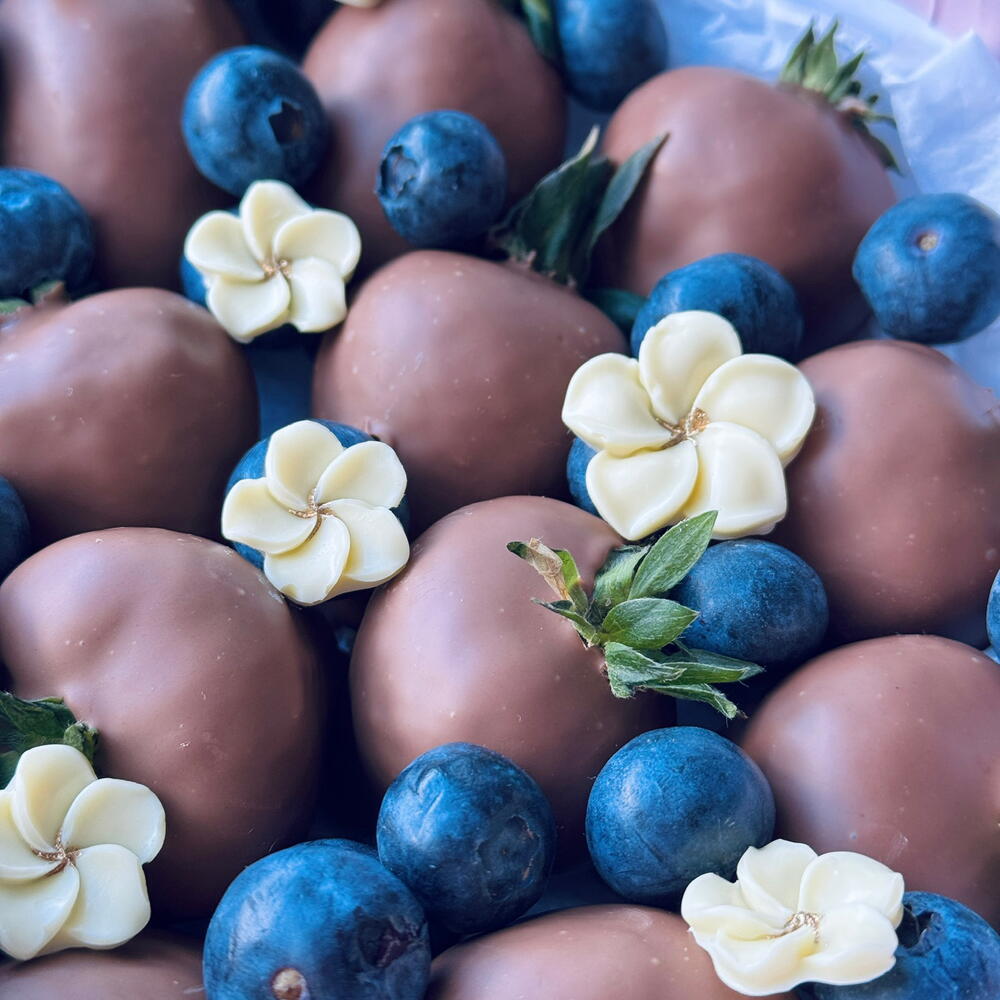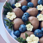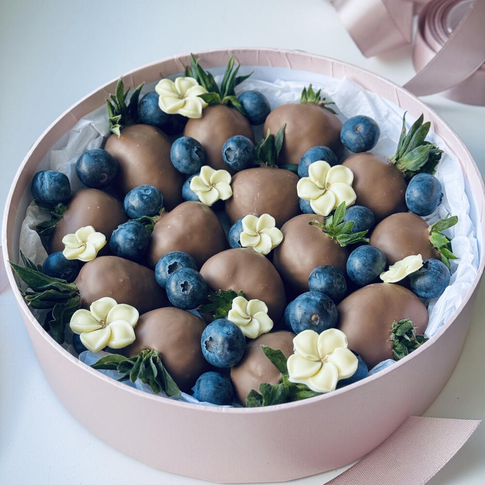 Eleganckie pudełko upominkowe z soczystymi truskawkami obleczonymi aksamitną mleczną czekoladą, uzupełnione świeżymi borówkami i delikatnymi dekoracyjnymi akcentami. Idealne połączenie smaku i estetyki, które zachwyca od pierwszego spojrzenia. Ten deser stanowi stylowy prezent na każdą specjalną okazję lub słodką niespodziankę bez okazji. Każda jagoda jest starannie wyselekcjonowana i pięknie ułożona z dbałością o szczegóły. Dostępne tylko na zamówienie.