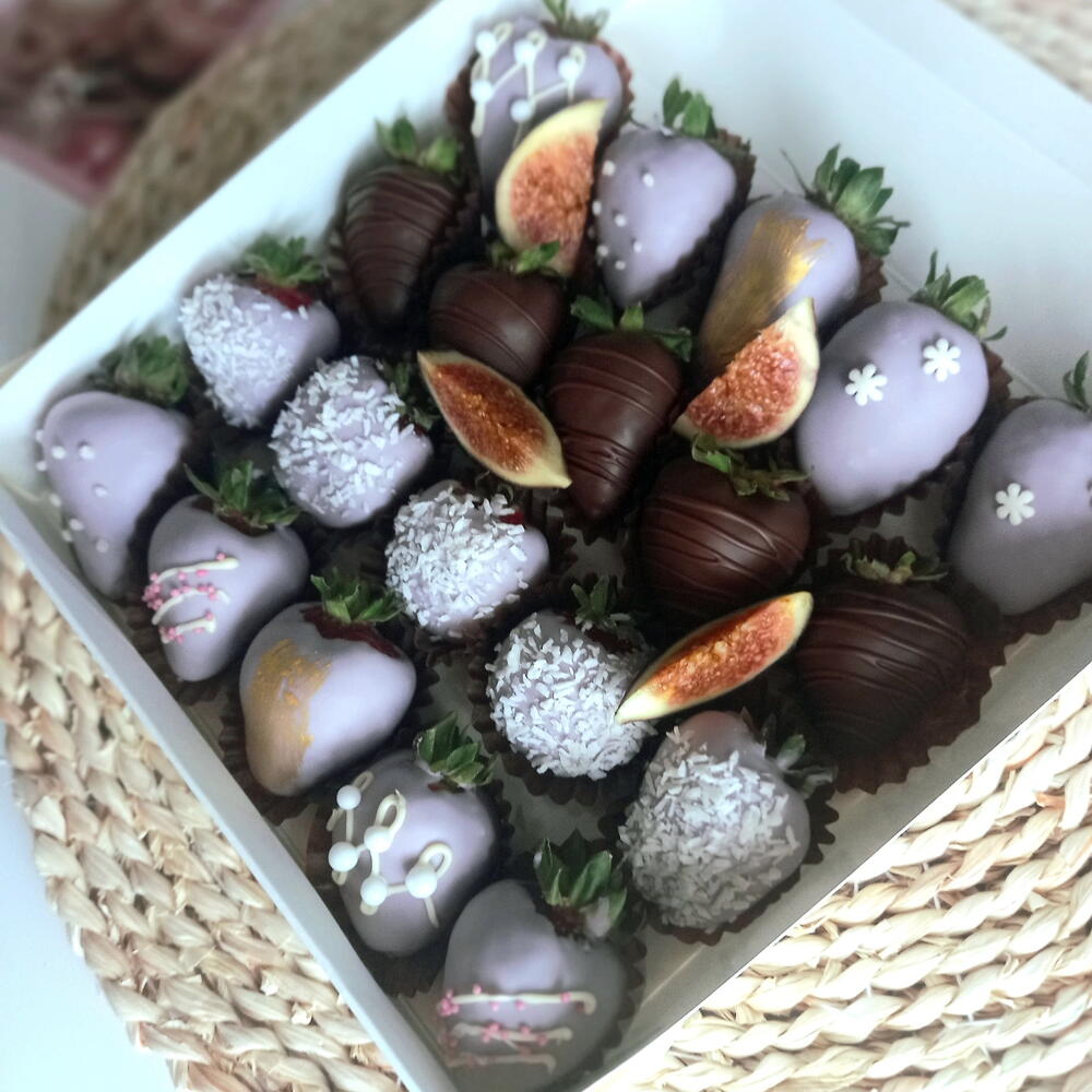 Świeże truskawki, czekolada mleczna, czekolada biała, figi, barwnik spożywczy