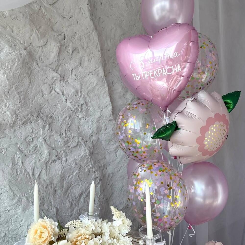Included: 1 bouquet: flower, 1 heart 45 cm with inscription "Happy March 8th, You Are Beautiful", 4 balloons 30 cm metallic, 4 balloons 30 cm with confetti) 1 weight 1 bag for transportation Total number of balloons: 10 Filling: All balloons with helium длина, мм: 2000 ширина, мм: 2000 высота, мм: 2000