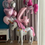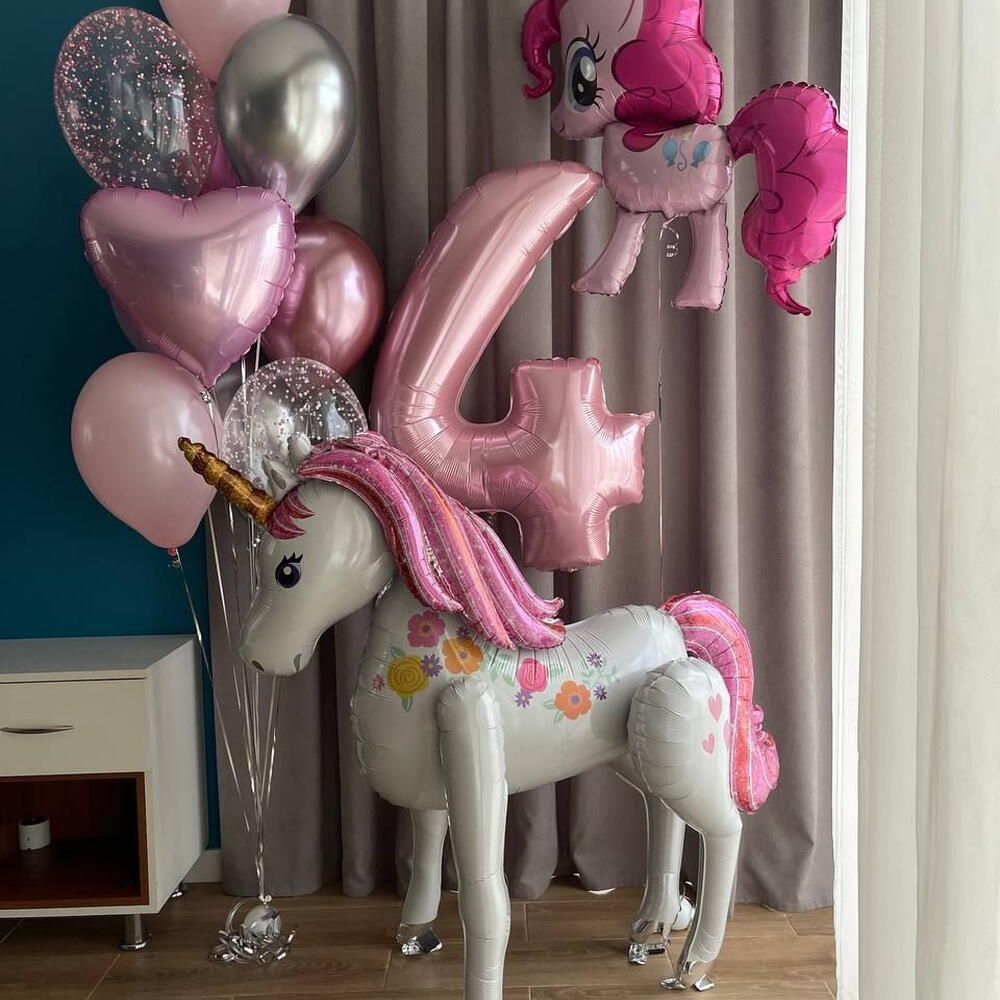 Included in the set: Number 1 standing figure: unicorn 1 figure: Pinkie Pie 1 bouquet of 10 balloons ( 1 heart 45cm , 2 balloons 30cm pastel, 2 balloons 30cm with foam beads, 5 balloons 30cm chrome) 3 weights 3 bags for transportation Total number of balloons: 13 Filling: All balloons with helium длина, мм: 2000 ширина, мм: 2000 высота, мм: 2000