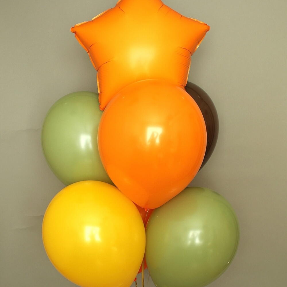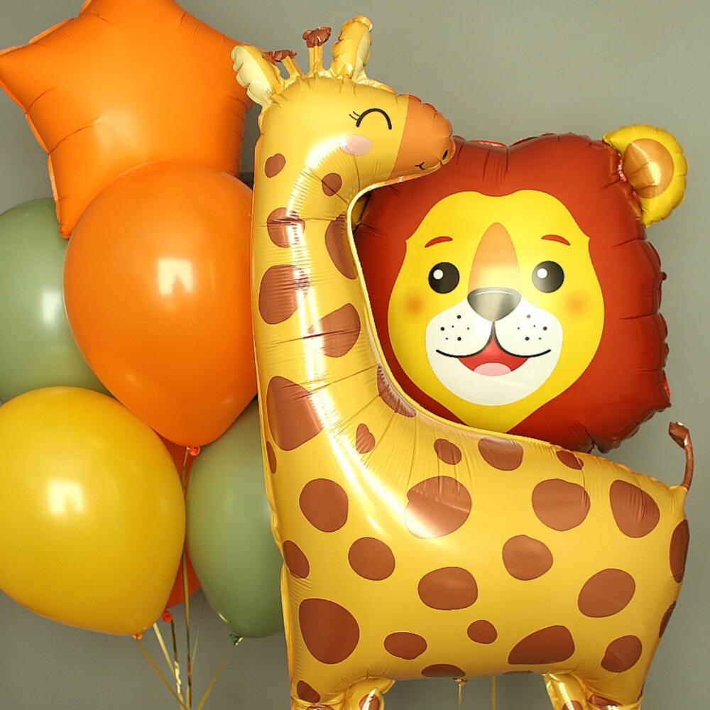 Zestaw Safari zawiera: ▫️Foliowy balon w kształcie żyrafy; ▪️Foliowy balon w kształcie Lwa; ▫️Foliowy balon w kształcie gwiazdki; ▪️6 balonów lateksowych; ▫️ Worek ochronny do bezpiecznego transportu balonów; ▪️Wstążka atlasowa; ▫️Obciążnik.
