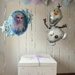 Cena zawiera: 11 balonów lateksowych; 4 balonów chromowanych; Balon foliowy w kształcie Elsy i Anny; Balon foliowy w kształcie Olafa; Pudełko balonowe 70*70 cm z indywidualną personalizacją; Wstążkę satynową; Obciążnik; Torby transportowe.