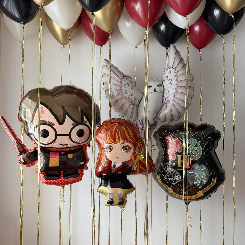 Cena zawiera: 15 balonów lateksowych; 5 balonów chromowanych; Balon foliowy w kształcie Harry`ego Pottera; Balon foliowy w kształcie Hermiony; Balon foliowy w kształcie sowy Hedwigi; Balon foliowy w kształcie herbu Hogwartu; Wstążkę satynową; Obciążnik; Torby transportowe.