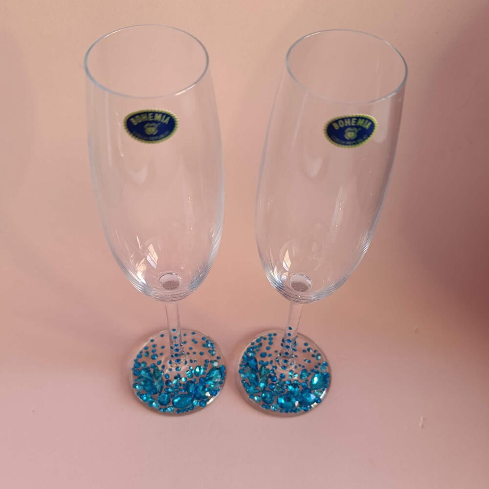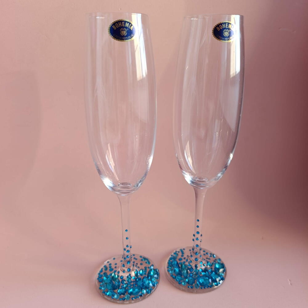 Luxury Bohemia Champagne Flute Set (2 pcs) Celebrate special moments with this elegant set of two Bohemia champagne flutes, exquisitely hand-decorated with sparkling rhinestones and decorative stones. Crafted from high-quality Bohemia crystal, these flutes combine timeless European craftsmanship with glamorous details that beautifully reflect the light. Perfect for weddings, anniversaries, engagements, or a luxurious gift, this set adds sophistication and sparkle to every toast.