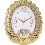Description: Add a touch of elegance and luxury to your space with this Golden Peacock Wall Clock. Crafted with intricate detailing, the clock features a stunning peacock feather frame adorned with shimmering accents and twin swans forming a heart at the base. The bold numbers and sleek golden hands ensure easy readability while enhancing the clock’s regal appeal. Perfect for living rooms, hallways, or as a statement gift for weddings, anniversaries, or housewarmings. A timeless blend of function and decor that brings beauty to every moment! • Material: Durable resin with golden finish • Size: [Add dimensions if known] • Quartz movement for accurate timekeeping • Battery operated (1x AA battery) • Ready to hang