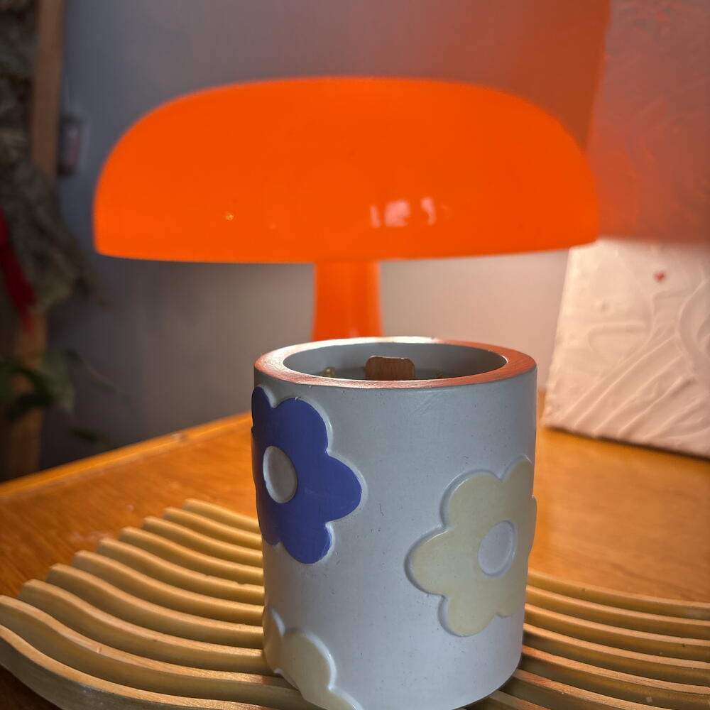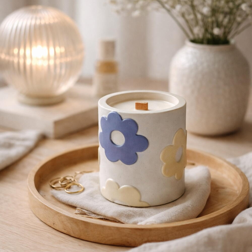 Świeca “Lato w słoiku” Świeca w gipsowym świeczniku wykonanym i ręcznie malowanym. Delikatna forma z wypukłymi kwiatami zachowuje ślad pracy twórcy, dlatego każdy egzemplarz ma swój niepowtarzalny charakter. W środku znajduje się 160 ml wosku sojowego o zapachu sandał i wanilia - miękkim, otulającym, jak ciepły wieczór w środku lata. Po wypaleniu wosku świecznik można wykorzystać jako miejsce na drobiazgi. Handmade, naturalne materiały i uczucie ciepła zamknięte w artystycznej formie.