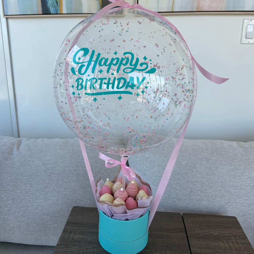 Happy Birthday Bobo balloon and chocolate dipped strawberries