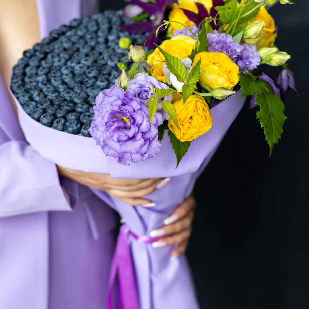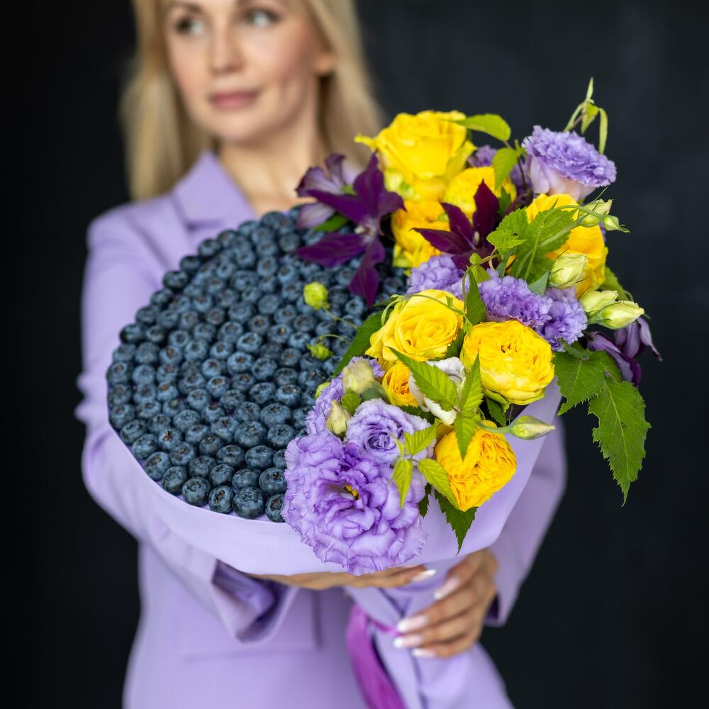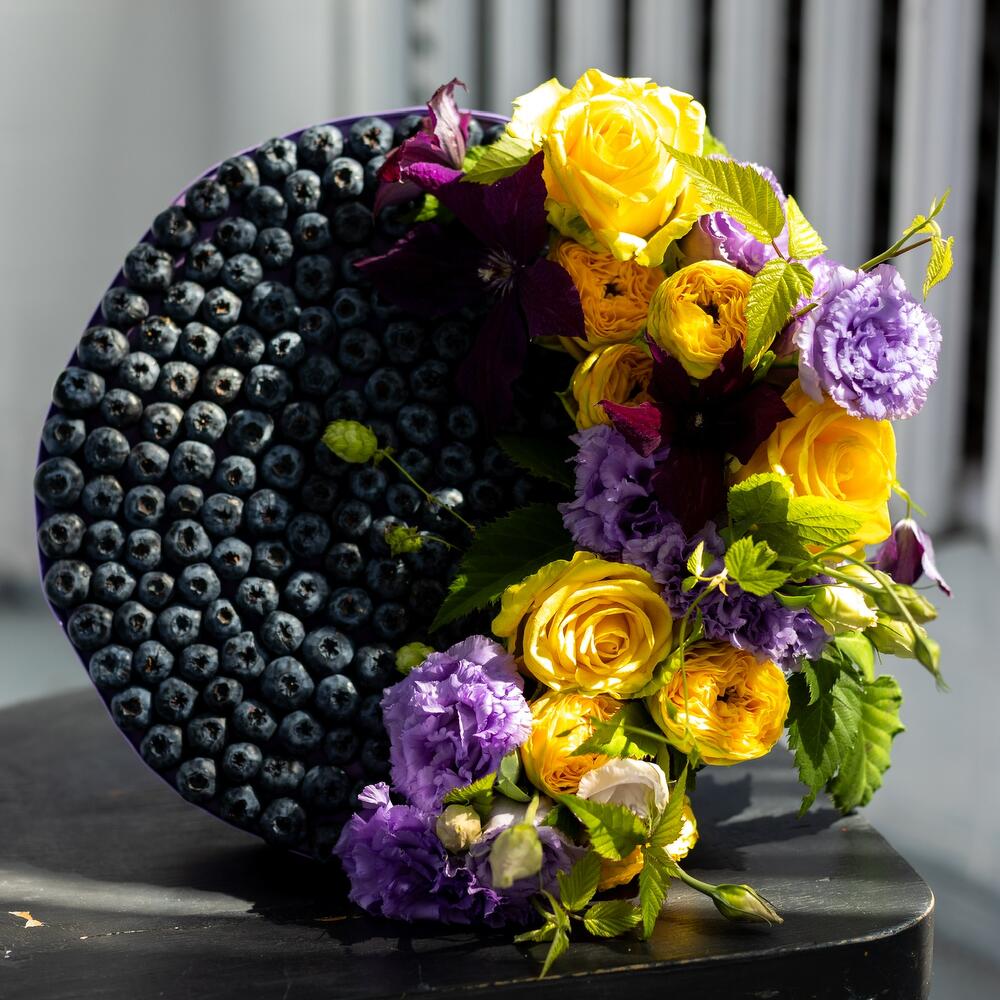 Meet the unique bouquet of blueberries with flowers that you havent seen before! This amazing bouquet combines the tenderness of blueberries with the brightness and beauty of colorful flowers, creating a unique image of magnificence and refinement. Each flower and each berry in this bouquet is like a separate note, complementing the overall aroma of the delightful combination in the composition. Allow yourself to enjoy this unique bouquet, which will become not only a visual but also a tasty pleasure.