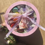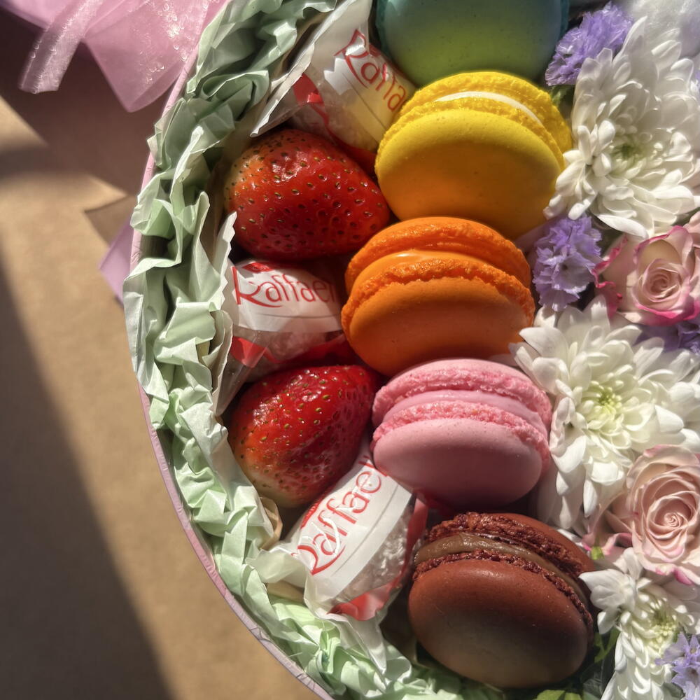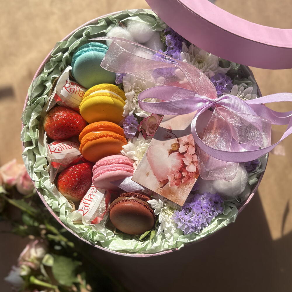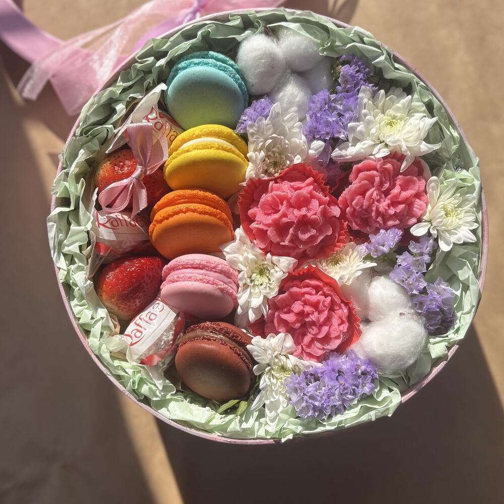 Chryzantema - 1 szt. Pudełko - 1 szt. Raffaello - 3 szt. Bawełna - 2 szt. macaroni - 6 szt. róże - 3 szt.