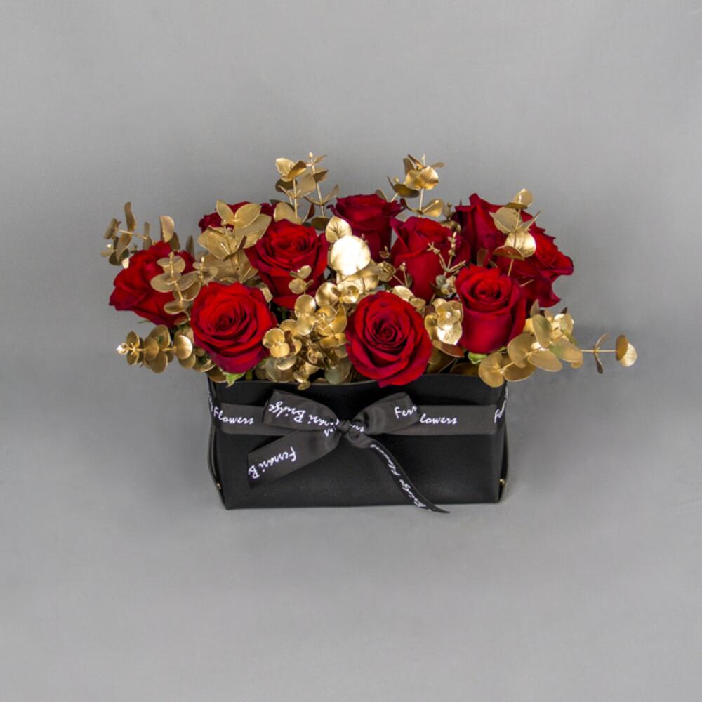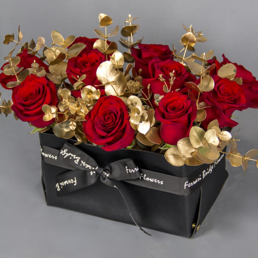 A black leather bag with red Roses and gold Eucalyptus.