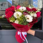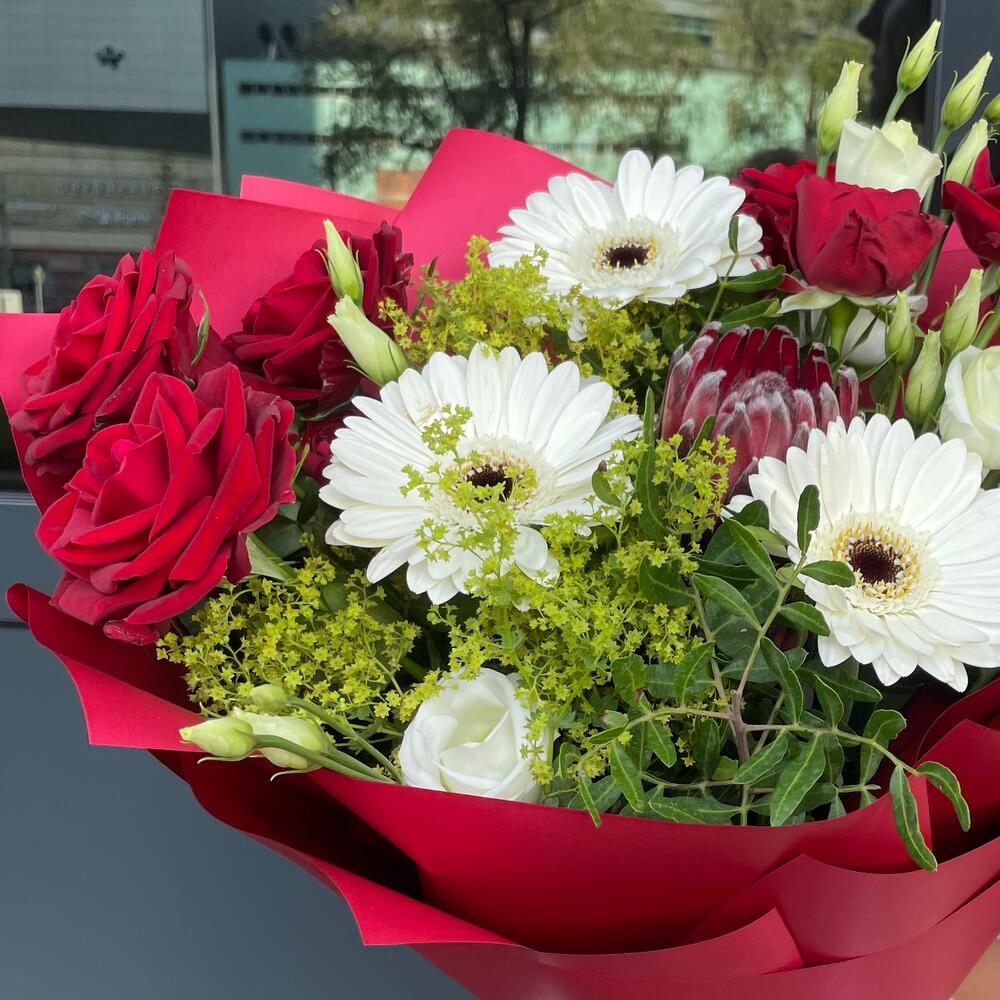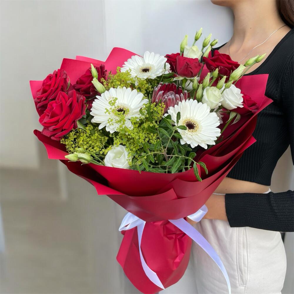 Róża - 7 szt. Eustoma - 2 szt. Gerbera - 3 szt. zielony - 4 szt. protea - 1 szt. opakowania na kwiaty - 3 szt.