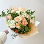 Eustoma - 3 szt. smulkaižiedės rožės - 4 szt. žaluma - 3 szt. įpakavimas - 3 szt.