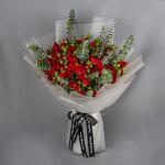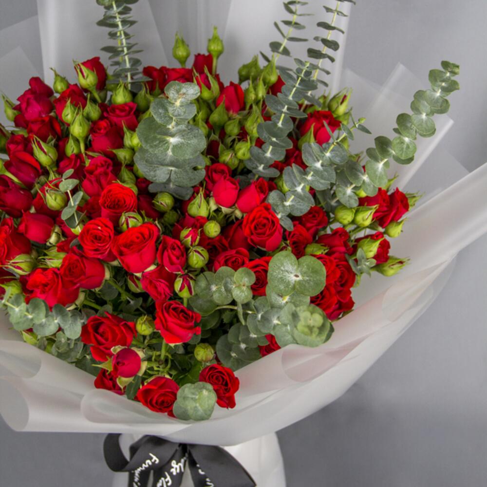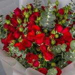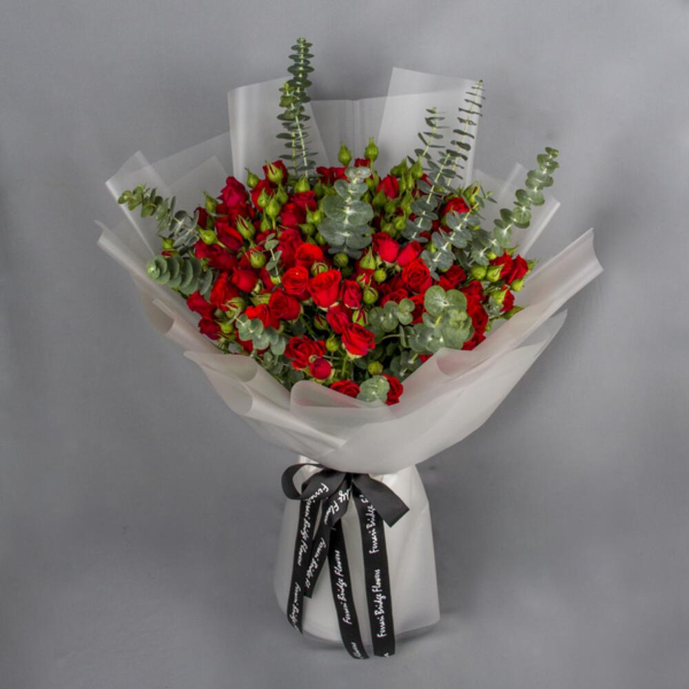 A bouquet with red Spray Roses and Eucalyptus in a clear wrapping paper.