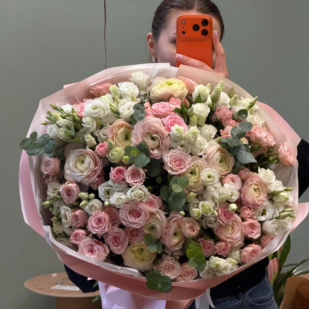 Eustoma - 13 szt. ranunculus - 13 szt. róża gałązkowa - 17 szt.
