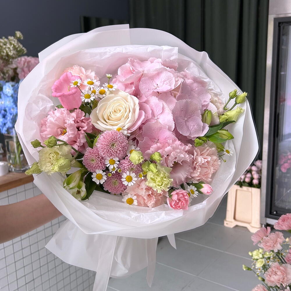 Hydrangea - 1 szt. Alstroemeria - 2 szt. Lisianthus - 2 szt. rose - 1 szt. santini - 1 szt. carnation - 4 szt. camomile - 1 szt. campanula - 1 szt.